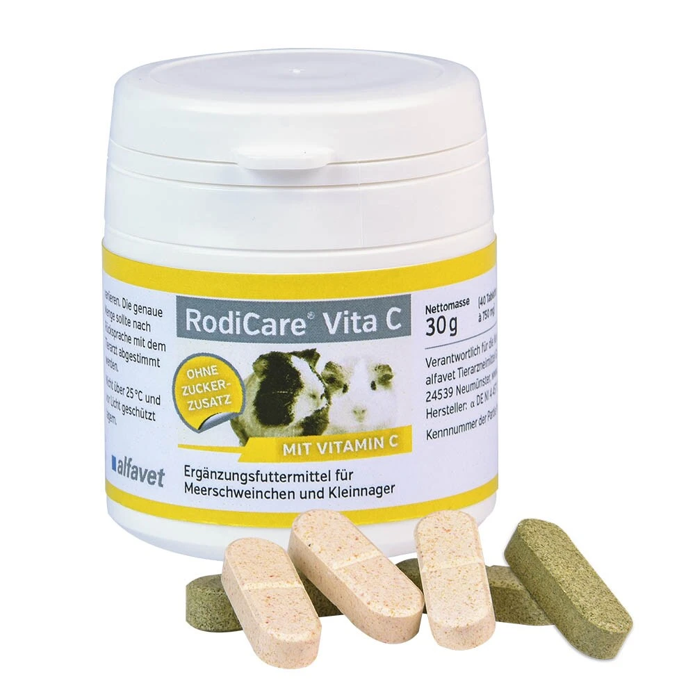 RodiCare®Vita C dient der Ergänzung der Nahrung mit Vitamin C. Meerschweinchen sind nicht wie andere Säugetiere in der Lage, Vitamin C selbst zu synthetisieren. Ein Mangel an Vitamin C kann bei einseitiger Ernährung entstehen. Aber auch Infektionen, Verdauungsstörungen, Belastung und Stress können bei Meerschweinchen und Kleinnagern einen erhöhten Bedarf zur Folge haben. Überschüssiges Vitamin C wird über die Nieren ausgeschieden.