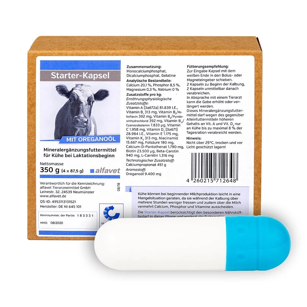 Kühe können bei beginnender Milchproduktion leicht in eine Mangelsituation geraten, da sie während der Kalbung über mehrere Stunden weniger fressen und zudem über die Milch vermehrt Calcium, Phosphor und Vitamine ausscheiden. Die Starter-Kapsel berücksichtigt den besonderen Nährstoffbedarf in dieser Phase und ergänzt die Futterration zum Laktationsbeginn gezielt mit Calcium, Phosphor und Vitaminen, um die einsetzende Milchbildung zu unterstützen.