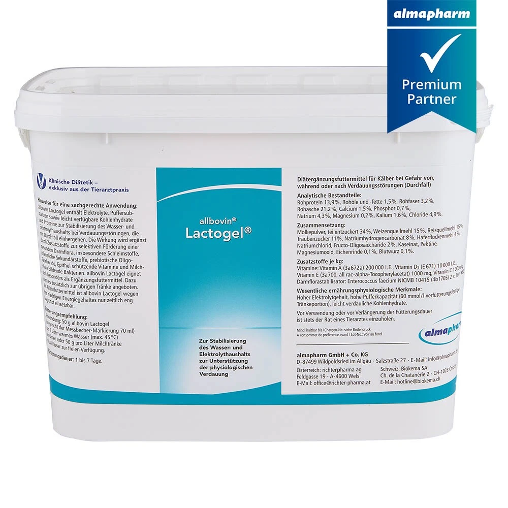 allbovin® Lactogel® enthält Elektrolyte, Puffersubstanzen sowie leicht verfügbare Kohlenhydrate und Proteine zur Stabilisierung des Wasser- und Elektrolythaushalts bei Verdauungsstörungen, die mit Durchfall einhergehen. Die Wirkung wird ergänzt durch Zusatzstoffe zur selektiven Förderung einer gesunden Darmflora, insbesondere Schleimstoffe, pflanzliche Sekundärstoffe, prebiotische Oligo-Saccharide, Epithel schützende Vitamine und Milchsäure bildende Bakterien.