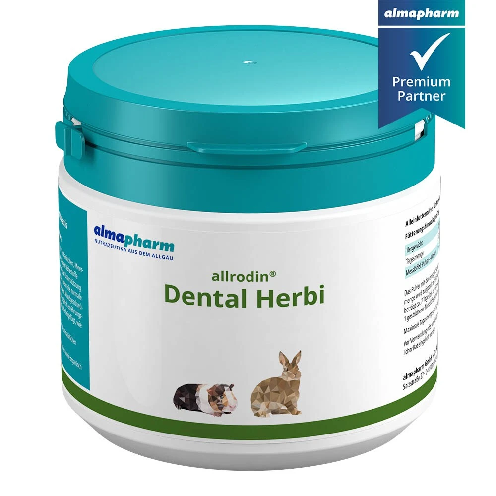 allrodin® Dental Herbi ist ein hochwertiges „Päppelfutter“ für Kaninchen, Meerschweinchen und Hamster. Es enthält alle lebenswichtigen Nährstoffe und vitalisierende Zusätze wie Fruchtkonzentrat aus Ananas mit nativem Gehalt an natürlichen Enzymen, Hefezubereitungen mit Beta-Glucanen und Nukleotiden sowie organisch gebundenes Zink.
