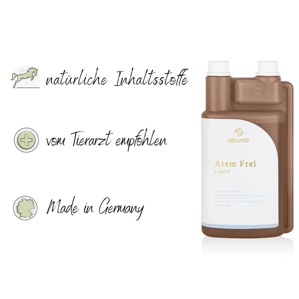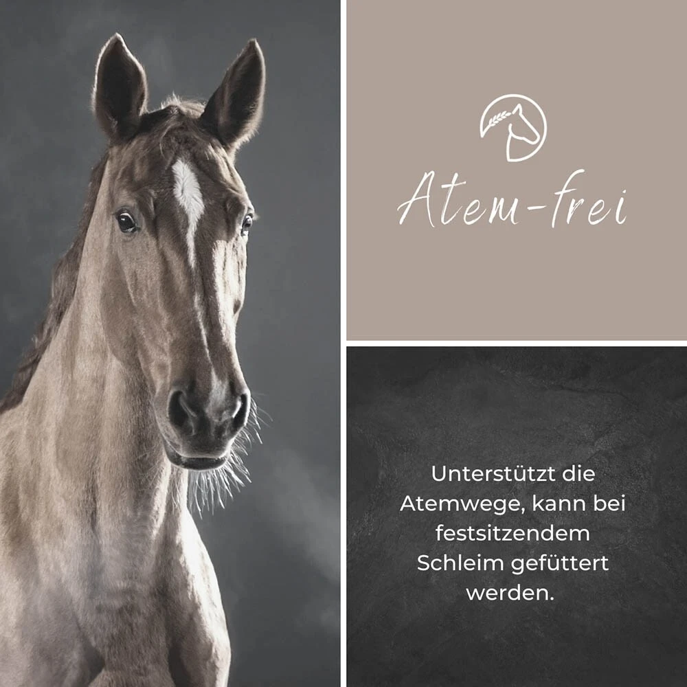 Atemfrei von Alpurial als Zusatzfutter für dein Pferd ist eine Mischung aus besten Kräutern in perfekter Zusammensetzung. Das für die Atemwege oft verwendete Schwarzkümmelöl wird kombiniert mit speziell auf den Atemtrakt abgestimmte Käuteröle wie Eucalyptus, Niaouli-Öl und weitere wertvolle Kräuter. Atemfrei ist hochdosiert und damit sehr ergiebig. Zudem ist die Entspannung der beanspruchten Muskulatur beim Husten ein Punkt, den man nicht vernachlässigen darf. Vitamin E unterstützt hier die Muskulatur.