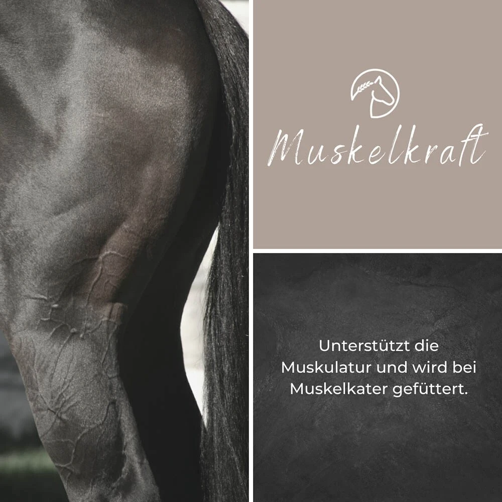 Muskelkraft von Alpurial als Zusatzfutter für dein Pferd unterstützt den Muskelstoffwechsel in Trainingsphasen. Aminosäuren unterstützen den Muskelaufbau und die Leistungsfähigkeit sowie die Kondition. Symptome wie Müdigkeit, schlechtes Leistungsvermögen, Muskel- und Gewichtsverlust können Resultat von mangelndem Eiweiß und Aminosäuren sein. Muskelkraft beinhaltet eine einzigartige Mischung von Aminosäuren, Vitaminen & Proteinen in einem optimalen Verhältnis. Selen und Vitamin E können einen positiven Einfluss auf die Rittigkeit haben und die Ausdauer deines Pferdes unterstützen.