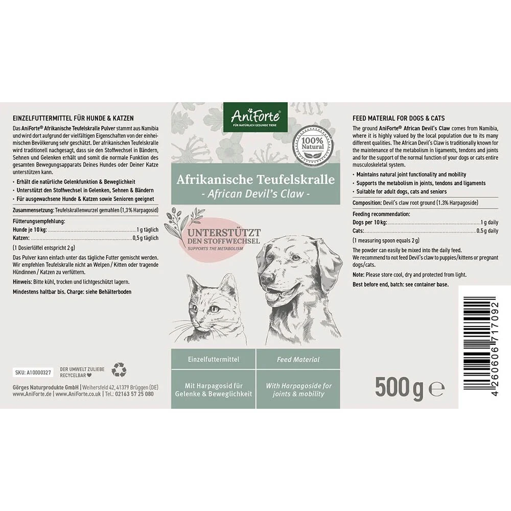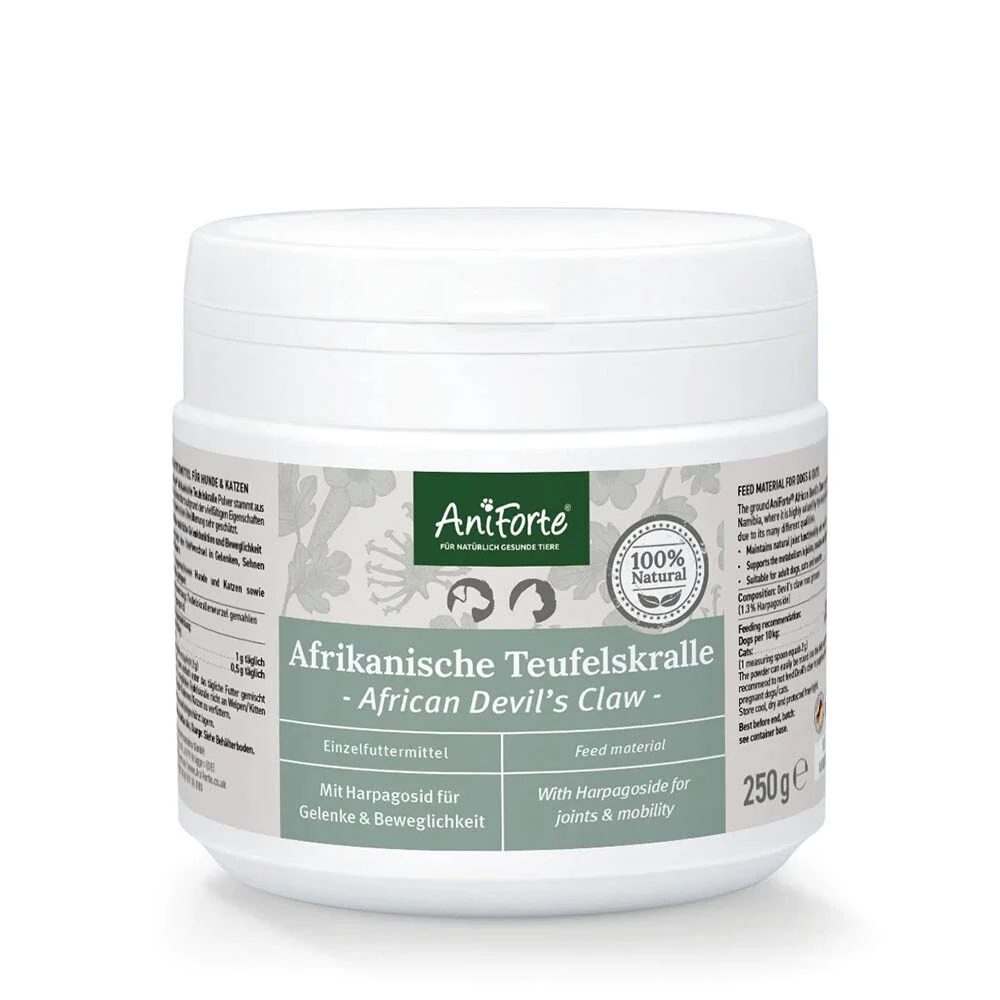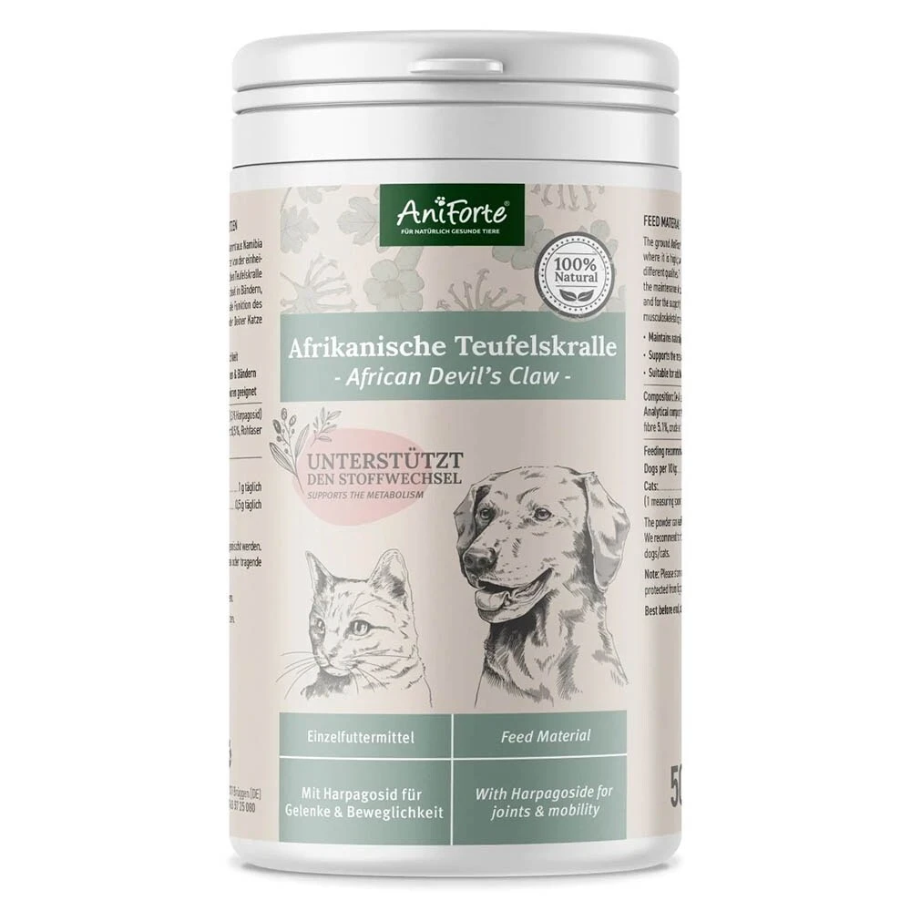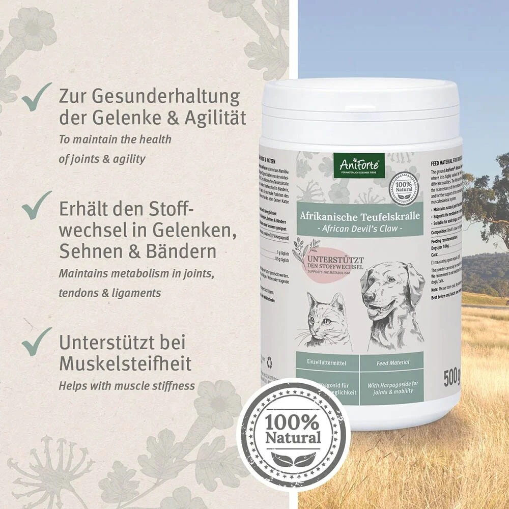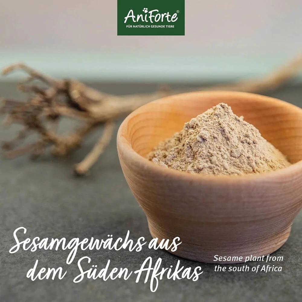 AniForte® Afrikanische Teufelskralle beinhaltet gemahlene Teufelskrallenwurzel und kann so dazu beitragen, den gesamten Bewegungsapparat sowie die normale Gelenkfunktion Deines Lieblings auf natürliche Weise positiv zu unterstützen.