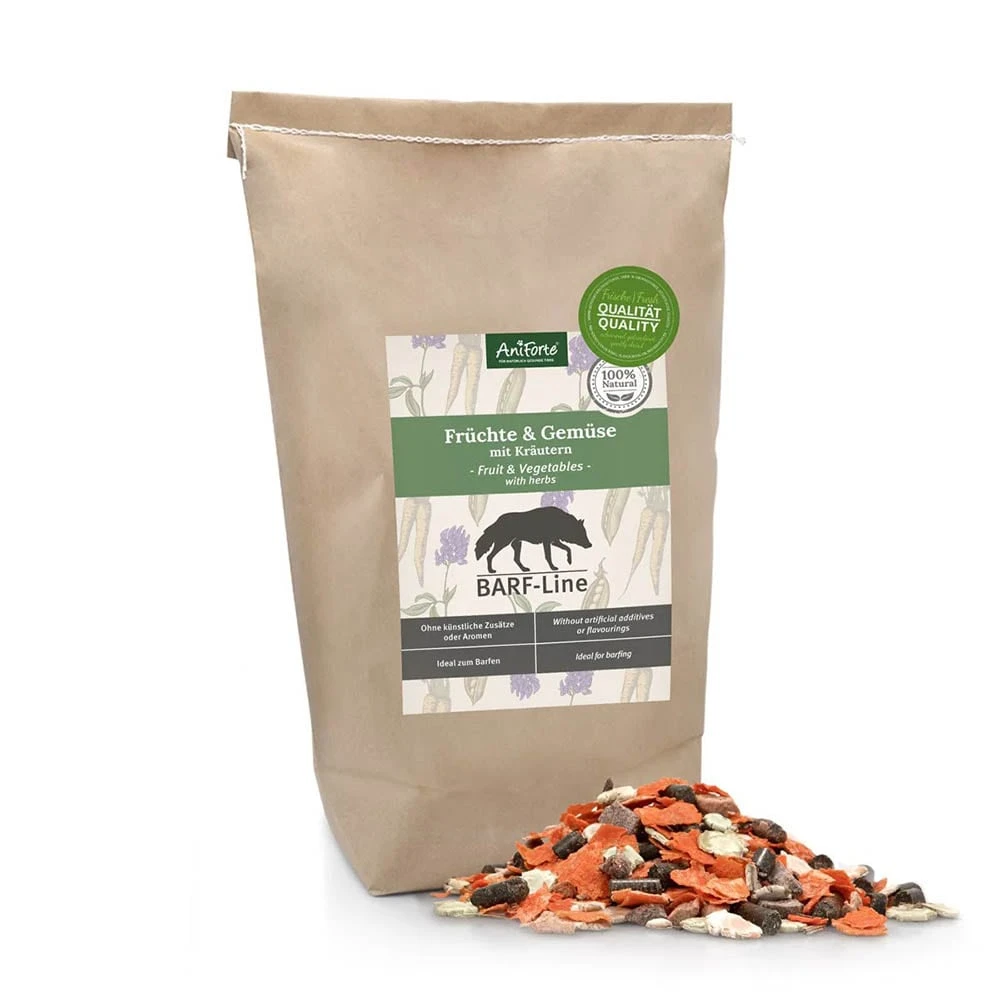 AniForte® Früchte & Gemüse mit Kräutern ist eine schonend getrocknete Mischung aus heimischen Früchten und Gemüsen. Die glutenfreie Zusammensetzung stellt eine vitale, nährstoffdichte Ergänzung für Ihren Vierbeiner dar und eignet sich ideal zum Barfen oder zum Mischen mit Dosenfleisch.