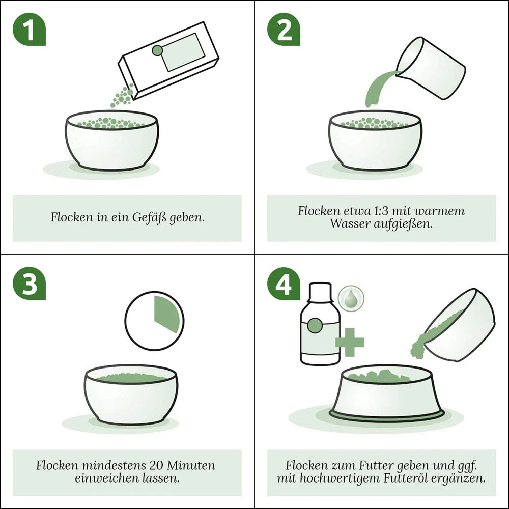 100 g der getrocknete Gemüseflocken für Hunde entsprechen ca. 250 g gequollenen Flocken.