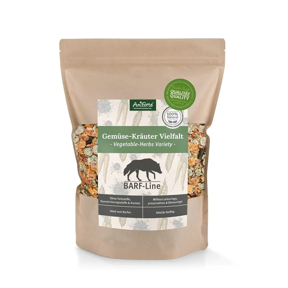 AniForte® Gemüse-Kräuter Vielfalt ist eine schonend getrocknete Mischung aus heimischen Kräutern und Gemüseflocken für Hunde. Die getreidefreie Zusammensetzung stellt eine vitale, nährstoffdichte Ergänzung für Hunde dar – ideal zum Barfen oder auch zum Mischen mit Dosenfleisch.