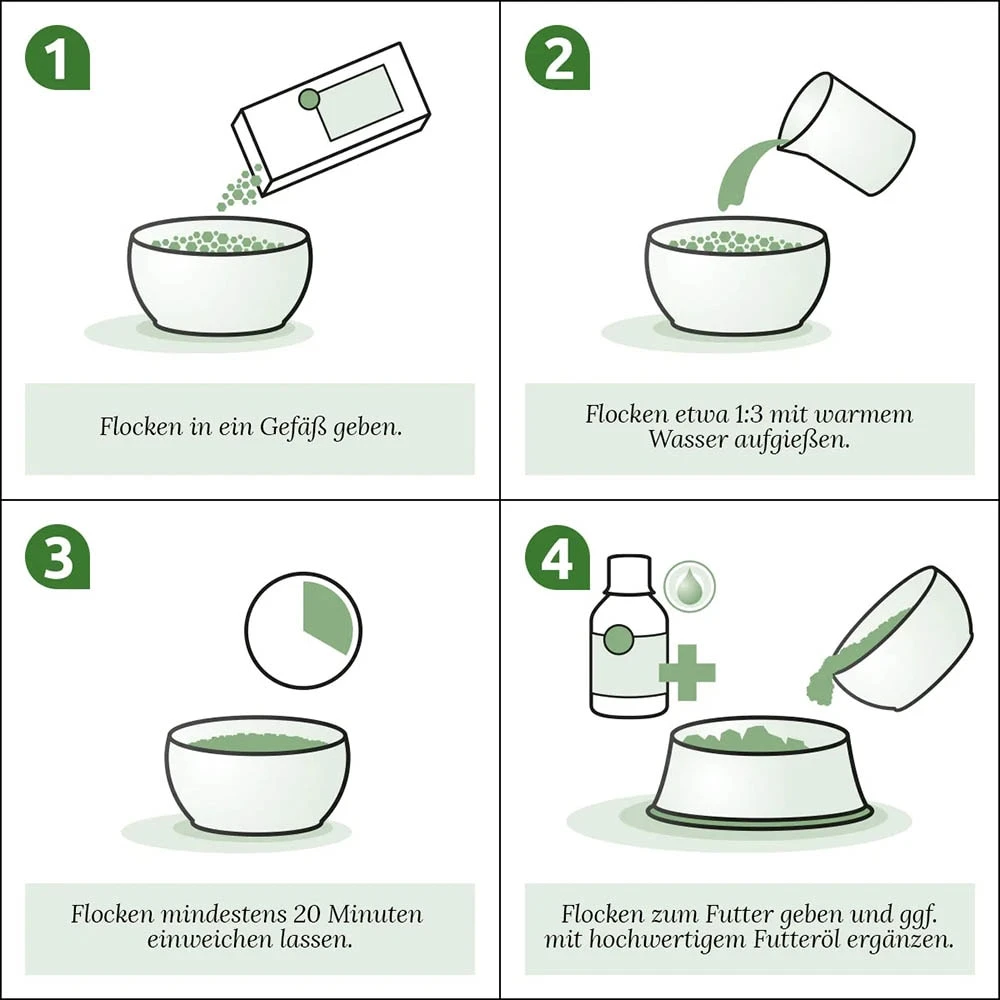 Die Flocken bitte 20 Minuten vor der Fütterung mit etwas Wasser oder Brühe anrühren und mit hochwertigem Frisch- oder Dosenfleisch vermischen – das ergibt eine wohltuende und leckere Mahlzeit. Empfehlenswert ist auch die Zugabe einer Vitamin-Mineralstoffmischung.