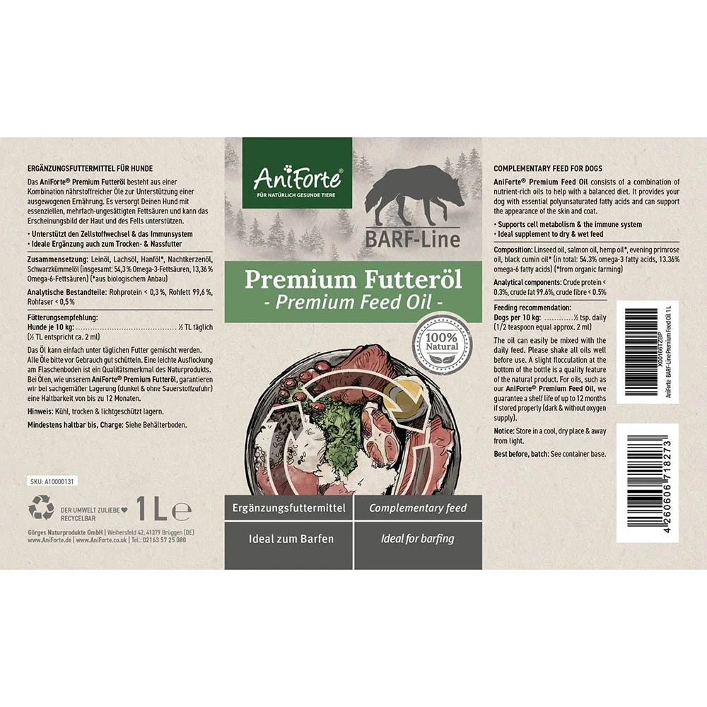 Das AniForte® Premium Futteröl für Hunde ist ein hochwertiges Ergänzungsfuttermittel zur Unterstützung einer ausgewogenen Ernährung. Eine Kombination nährstoffreicher Öle versorgt Ihren Liebling mit essenziellen, mehrfach ungesättigten Fettsäuren und kann das Erscheinungsbild der Haut und des Fells unterstützen.