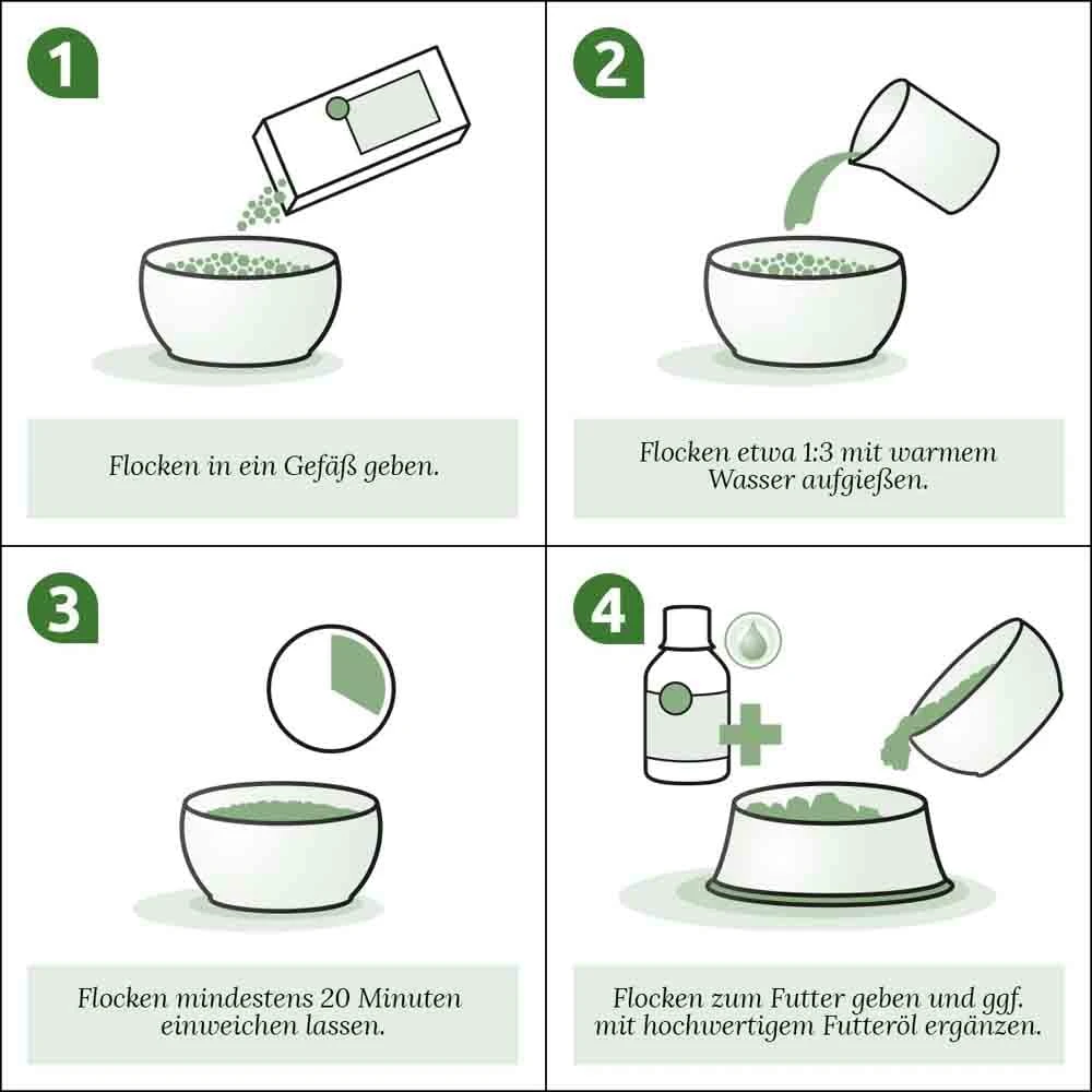 Die Flocken bitte 20 Minuten vor der Fütterung mit etwas Wasser oder Brühe anrühren und mit hochwertigem Frisch- oder Dosenfleisch vermischen – dies ergibt eine wohltuende und leckere Mahlzeit.