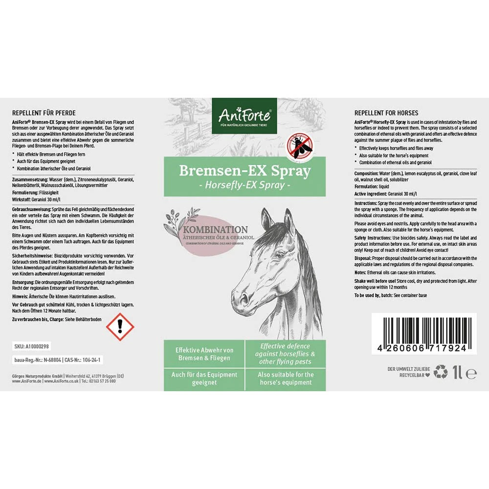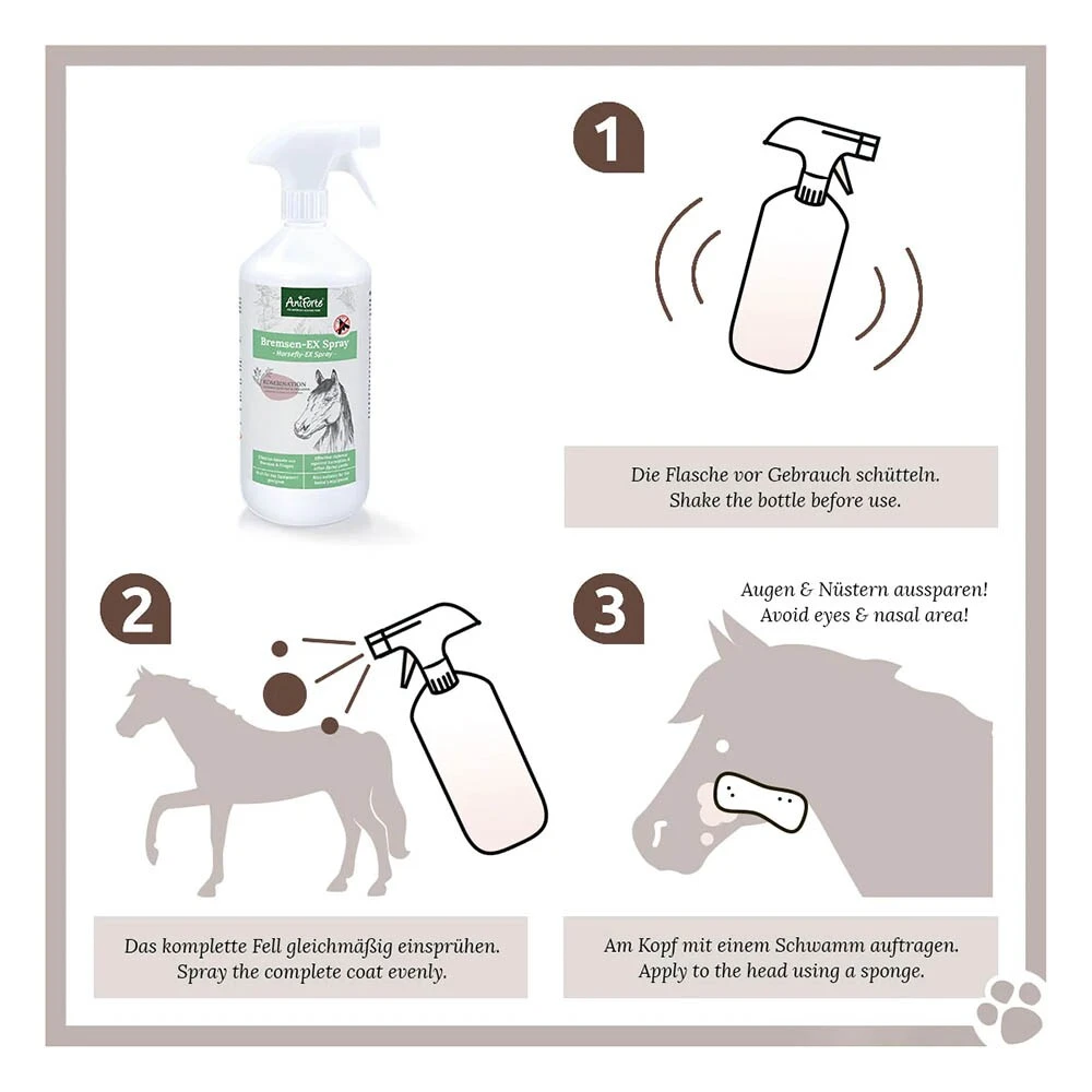 AniForte® Bremsen-EX Spray wird bei einem Befall von Fliegen und Bremsen oder zur Vorbeugung derer angewendet. Das Spray setzt sich aus einer ausgewählten Kombination ätherischer Öle mit Geraniol zusammen und bietet eine effektive Abwehr gegen die sommerliche Fliegen- und Bremsen-Plage bei Deinem Pferd.