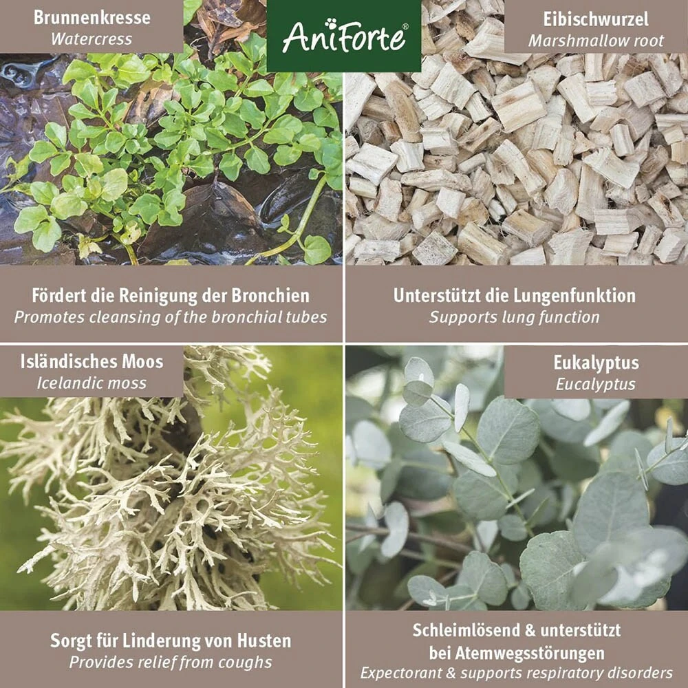 Die Mischung macht es bei unseren AniForte® Bronchial Kräutern. Aus hochwertigen Kräutern haben wir eine besonders effektive Kräutermischung als Ergänzung zum täglichen Futter Ihrer Pferde entwickelt. Enthalten sind Eukalyptus, Eibischwurzel, Thymian, Spitzwegerich und isländisches Moos. Abgerundet werden die Kräuter für Pferde von Brunnenkresse, Meerrettich, Oregano und Anis.