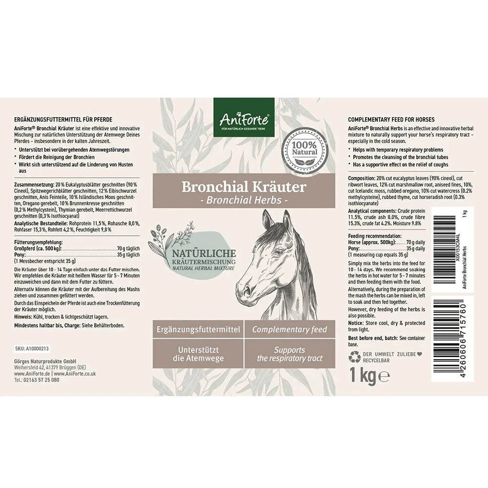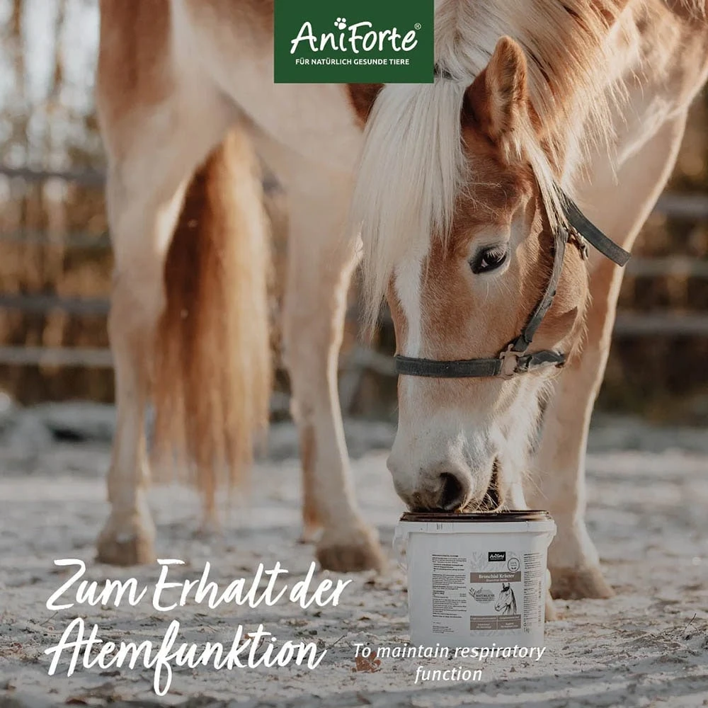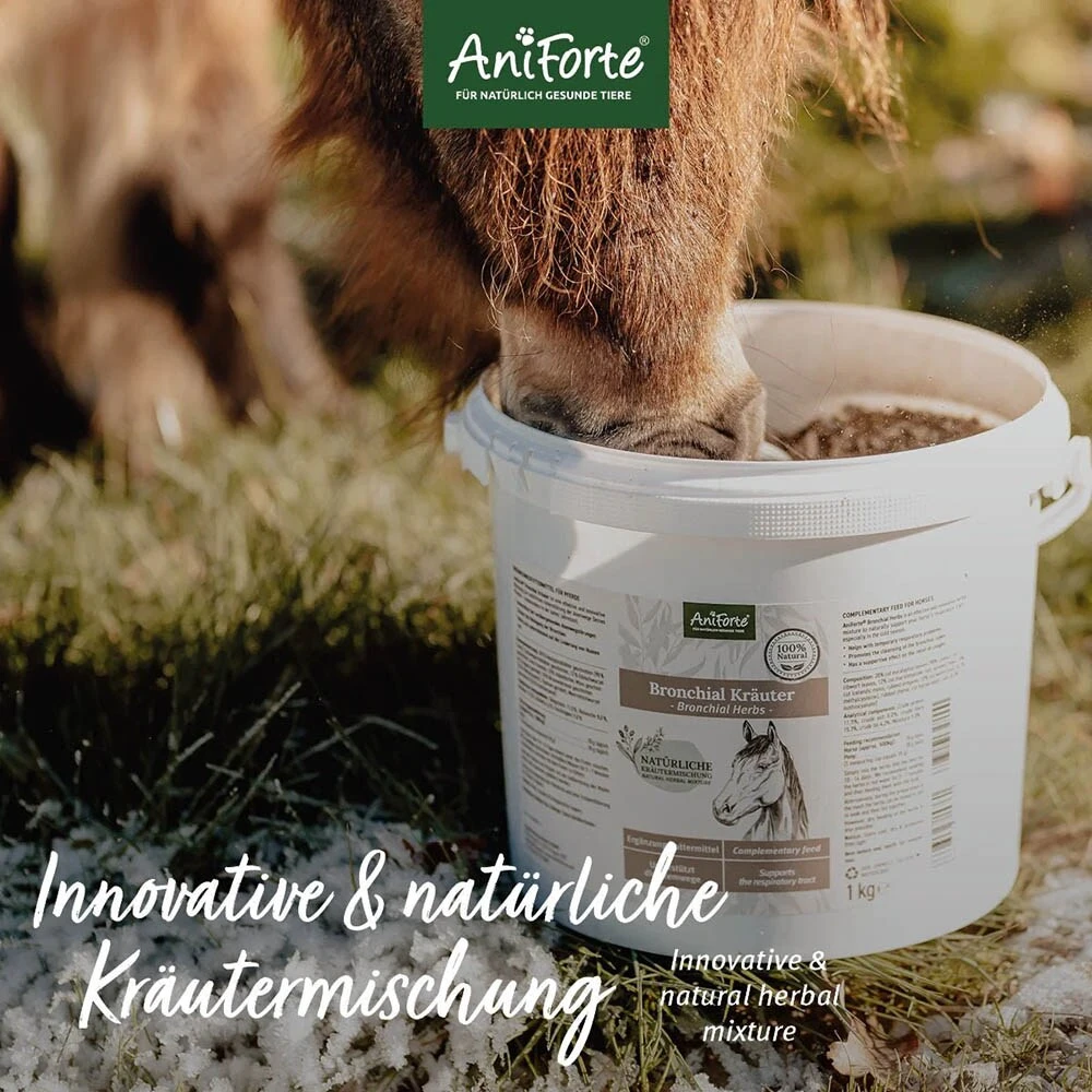 Sie möchten Ihrem Pferd und seiner Gesundheit in der kalten Jahreszeit etwas Gutes tun? Dann sind unsere AniForte® Bronchial Kräuter genau das Richtige. Unsere Bronchialkräuter für Pferde bestehen aus verschiedenen hochwertigen Kräutern, sind frei von jeglichen Zusatzstoffen und unterstützen die Atemwege Ihres Pferdes auf natürliche Weise. Während Pferde in der freien Natur von allein Gräser und Kräuter fressen, sollten Sie Ihrem Pferden nachhelfen. Über das tägliche Heu wird Ihrem Pferd die nötige Portion an Gräsern zur Verfügung gestellt. Nur bei den Kräutern könnte es schwer werden, deswegen können Sie Kräuter für Pferde kaufen, um Ihrem Pferd zu füttern.