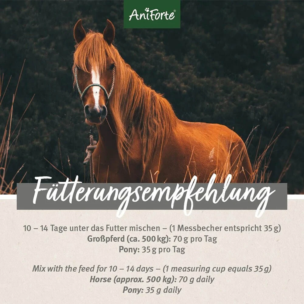 Bitte die Kräuter über 10 – 14 Tage einfach unter das Futter mischen. Wir empfehlen die Kräuter mit heißem Wasser für 5 – 7 Minuten einzuweichen und dann mit dem Futter zu füttern. Alternativ können die Kräuter jedoch auch mit der Aufbereitung des Mash ziehen und zusammen mit dem Mash gefüttert werden. Durch das Einspeicheln der Pferde ist jedoch auch eine Trockenfütterung der Kräuter möglich.