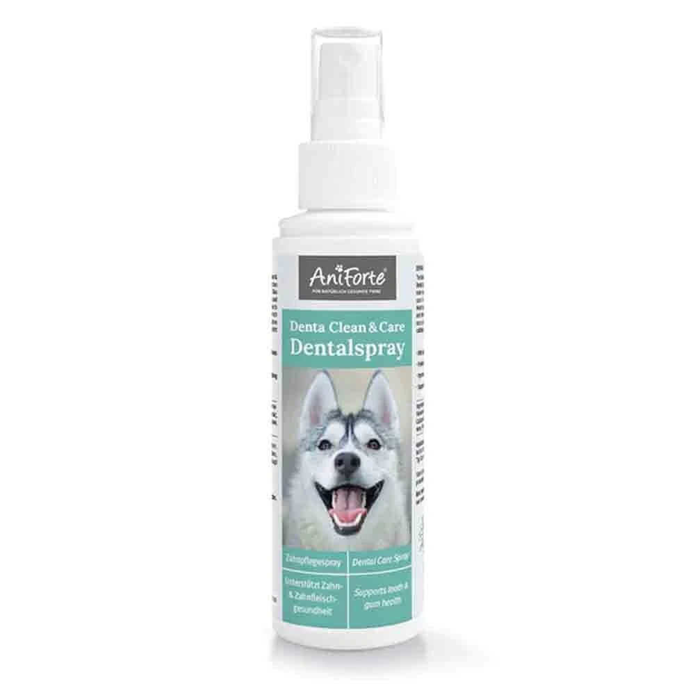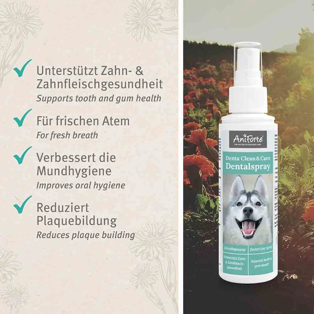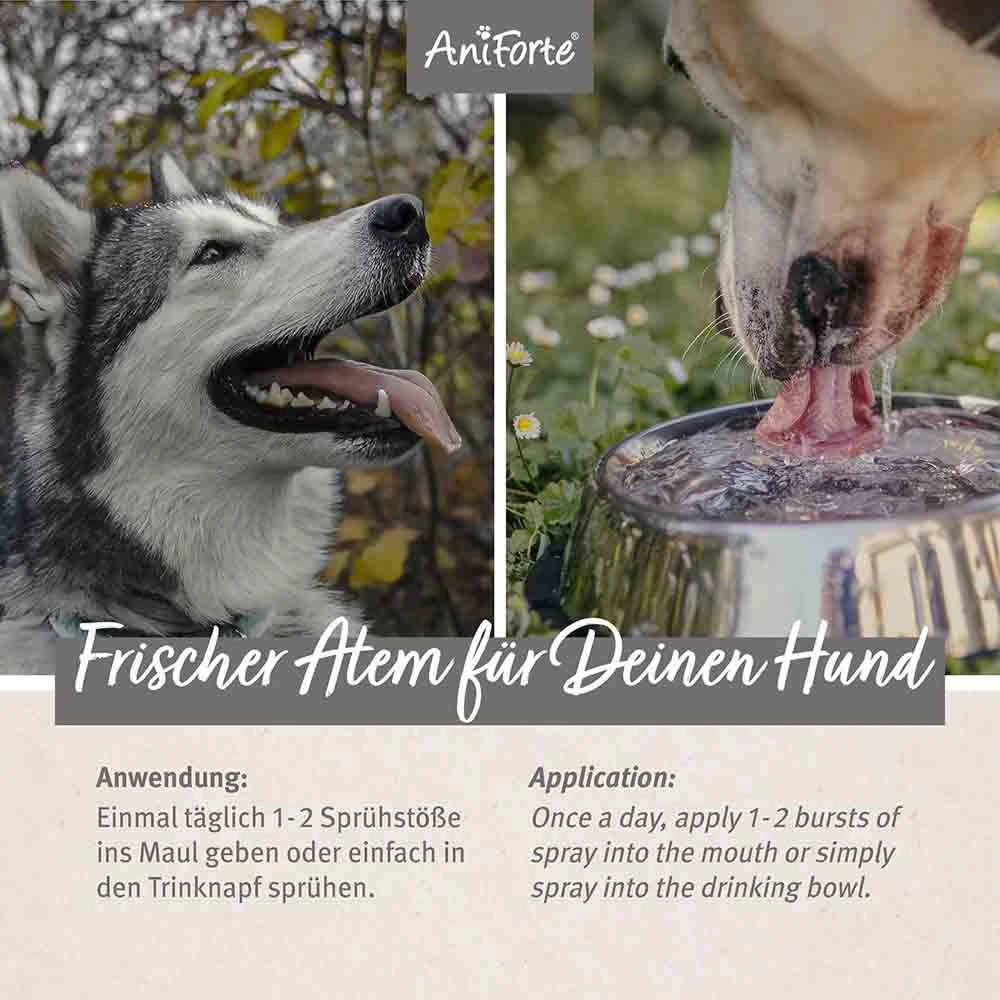 Da wir natürliche Inhaltsstoffe aus Pflanzenextrakten nutzen, eignet sich das Dentalspray für Hunde, die nicht alles vertragen. Das AniForte® Denta Clean & Care Dentalspray ist die flüssige Zahnbürste für Hunde – noch nie war Mundhygiene einfacher! Einmal täglich 1 – 2 Sprühstöße ins Maul oder ins Trinkwasser geben.