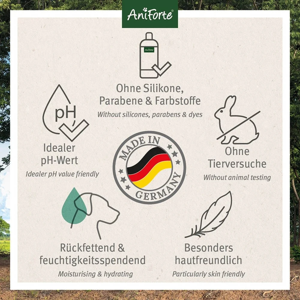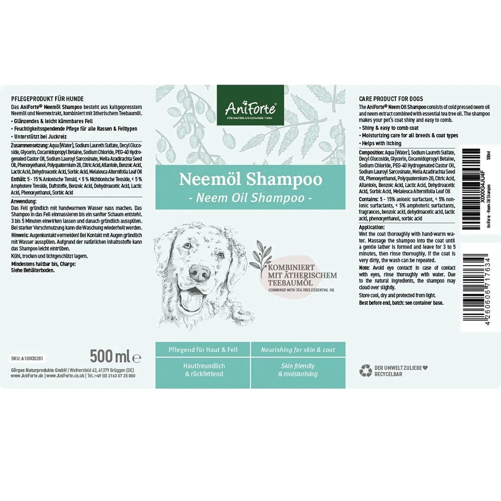 AniForte® Neemöl Shampoo ist hautfreundlich und angenehm im Geruch. Dank seiner rückfettenden Eigenschaft ist es gleichzeitig eine hervorragende feuchtigkeitsspendende Pflege für die Haut Ihres Lieblings – außerdem lässt es das Fell in neuem Glanz erscheinen. Durch die wertvollen Inhaltsstoffen ist das Fell leichter kämmbar. Das enthaltende Neemöl ist ein traditionelles indisches Heilmittel und wird aus den Samen des Neembaumes gewonnen. Das Teebaumöl unterstützt Ihren Vierbeiner bei Juckreiz.