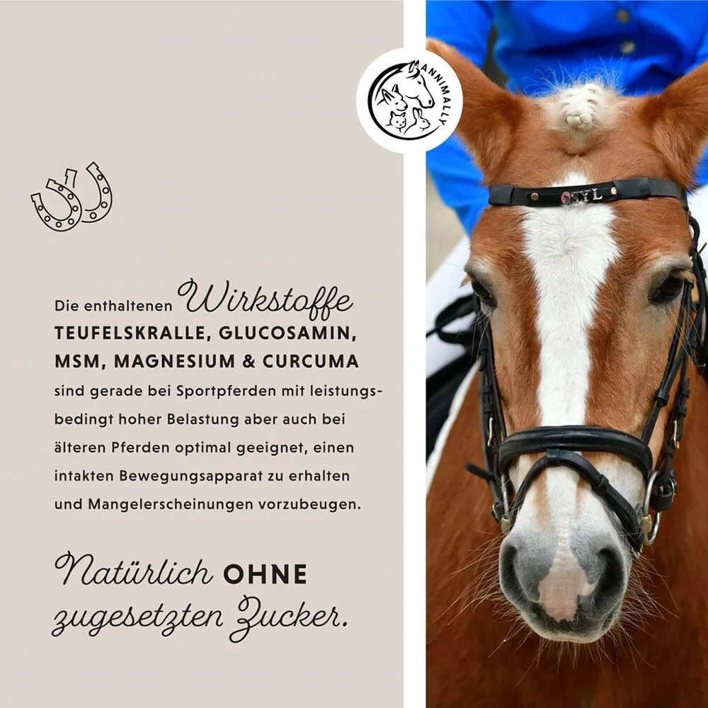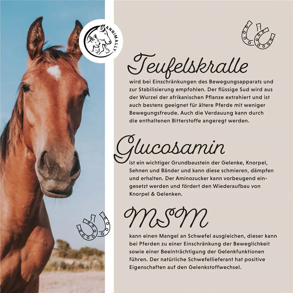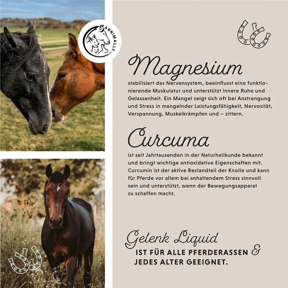 Das Gelenk Liquid unterstützt Pferde in alltäglichen Bewegungsabläufen und fördert die Funktion und Stabilität der Gelenke. Die Inhaltsstoffe tragen zum Wiederaufbau von Knorpelmasse bei und stimulieren den Gelenkstoffwechsel. Darüber hinaus kann das Gelenk Liquid die Funktionalität der Knochen und des Bindegewebes stärken. Gut geschmierte Gelenke sind entscheidend für reibungslose Bewegungsabläufe im Pferdekörper, wofür ausreichender Knorpel erforderlich ist. Poröser Knorpel führt zu Reibung und kann zu Schmerzen oder sogar chronischen Erkrankungen wie Arthrose führen.