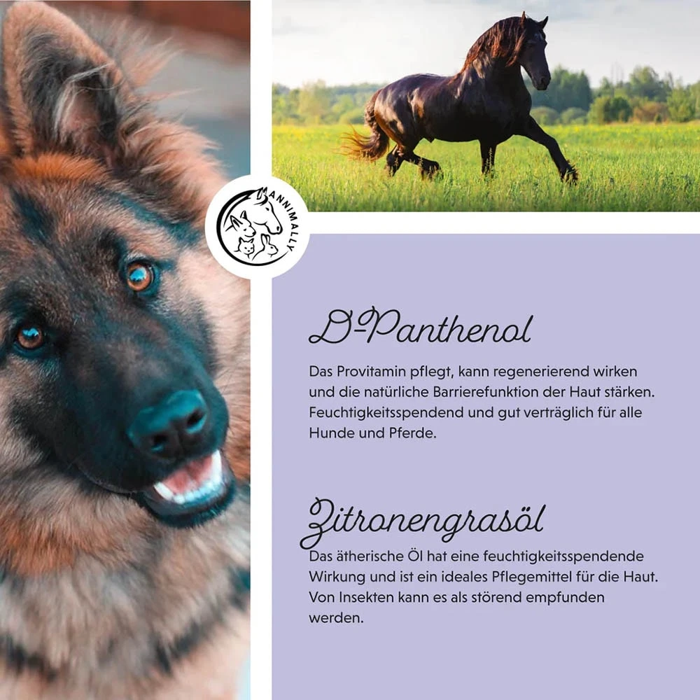 Das hautfreundliche Provitamin B5 (D-Panthenol) pflegt das Fell und die Mähne, während das natürliche Zitronengrasöl einen dezenten Duft hinterlässt.