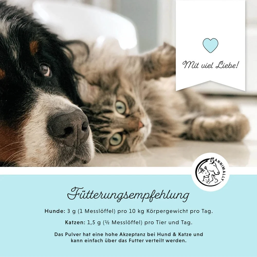 Wir empfehlen 1 Messlöffel (3 g) pro 10 kg und pro Tag. Wiegt Dein Hund etwas mehr, dürfen es also ruhig zwei-vier Messlöffel sein. Wohnt eine Katze bei Dir, ist 1/2 Messlöffel (1,5 g) pro Tag ideal. Der Messlöffel wird mitgeliefert und befindet sich in der Dose. Das leckere Pulver kannst Du einfach unter das Futter mischen.