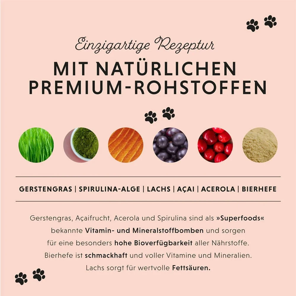 Bierhefe, Gerstengras (getrocknet, gemahlen), Burma Spirulina (getrocknet, gemahlen), Lachs (getrocknet, gemahlen), Açaifrucht (getrocknet, gemahlen), Acerola (getrocknet, gemahlen)