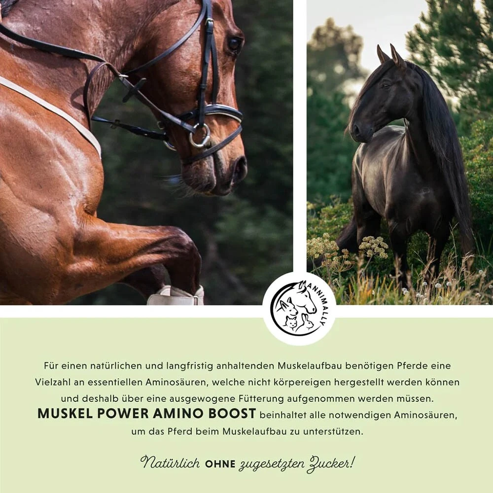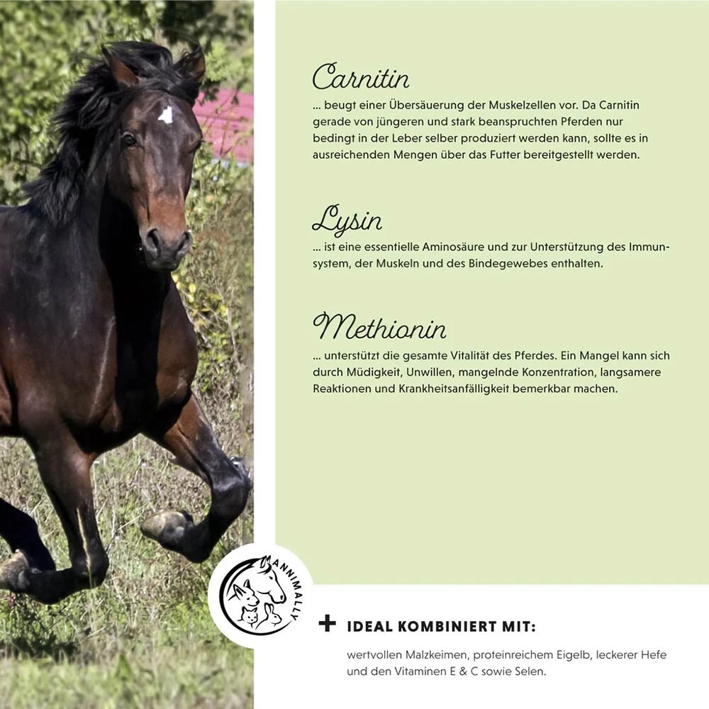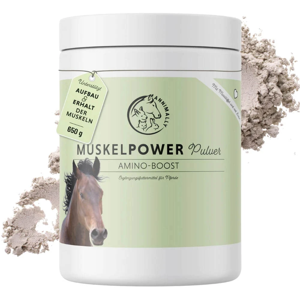 Um eine nachhaltige Muskelentwicklung und die Vermeidung von Muskelabbau zu gewährleisten, benötigt der Körper des Pferdes Aminosäuren. Nur wenn ein Pferd ausreichend mit den Aminosäuren L-Threonin, L-Lysin, DL-Methionin, L-Tryptophan und L-Carnitin versorgt wird, kann es seine volle Leistungsfähigkeit entfalten. Genau an diesem Punkt setzt das Muskelpower Pulver an, indem es das Pferd mit allen erforderlichen Bestandteilen versorgt, die den Muskeln zugutekommen.