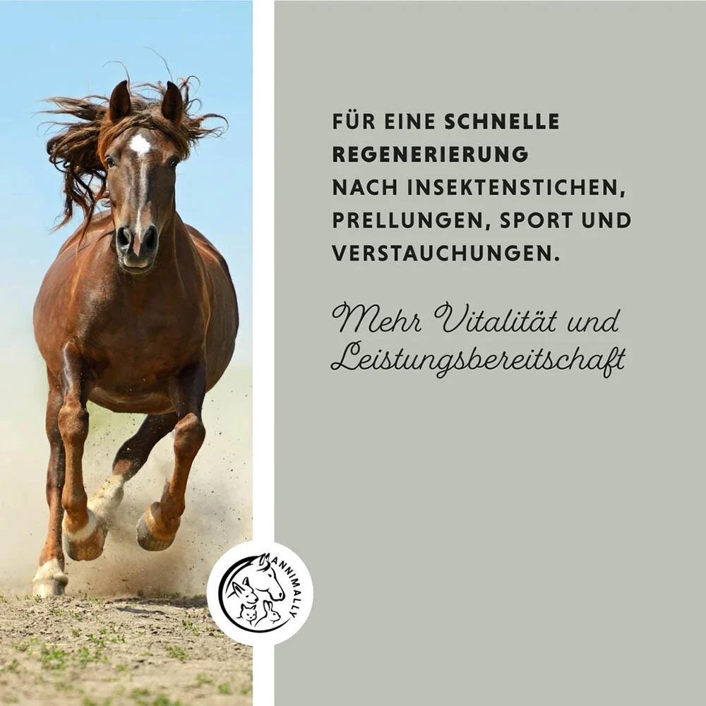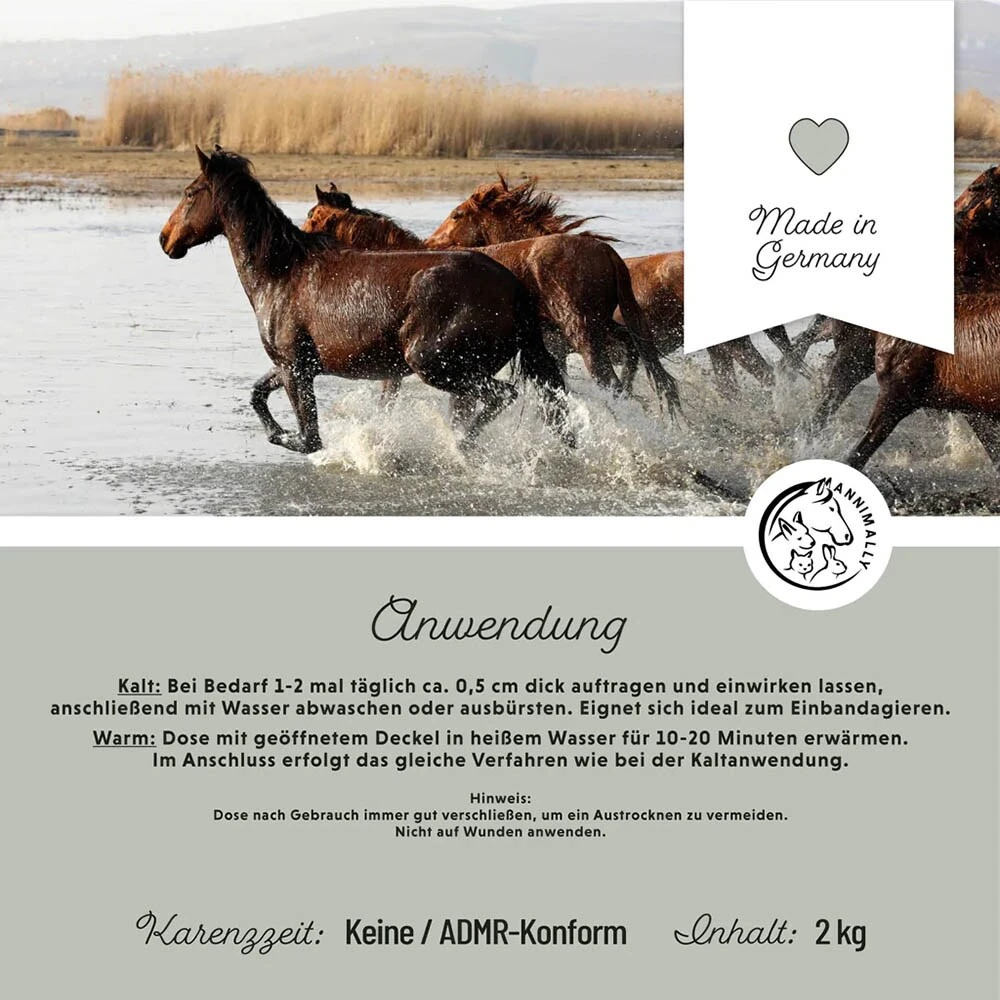Wenn belastete Pferdebeine völlige Erschöpfung bereiten, ist eine schnelle Entspannung gefragt. Die Tonerde kann auf natürliche Weise dazu beitragen, die Flüssigkeitsverteilung im Gewebe zu regulieren. Sie hat einen entspannenden, beruhigenden und erfrischenden Effekt auf das Pferd. Nach besonders intensiven Belastungen ist die Tonerde-Paste von Annimally eine Wohltat für den Bewegungsapparat und belebt strapazierte Pferdebeine. Auch anwendbar bei Insektenstichen, Prellungen oder Verstauchungen. Eine ideale Kombination wertvoller Inhaltsstoffe kann die Durchblutung fördern und Schwellungen lindern.