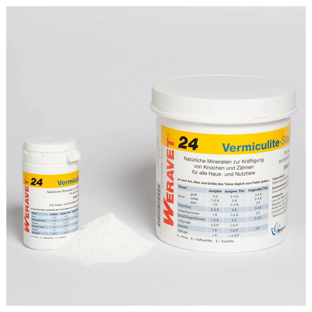 Ergänzungsfuttermittel (Mineralfuttermittel) für Haus- und Nutztiere mit Vermiculite und Calciumcarbonat zur Kräftigung von Knochen und Zähnen.