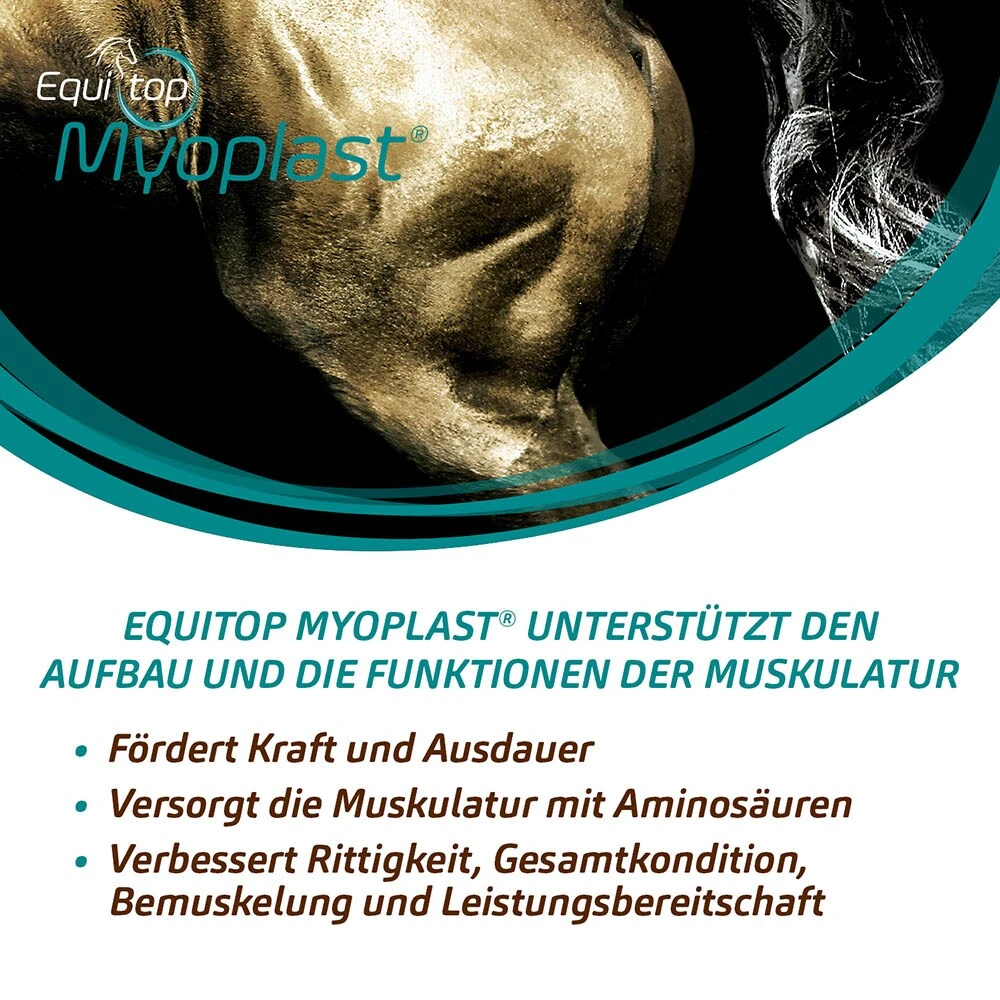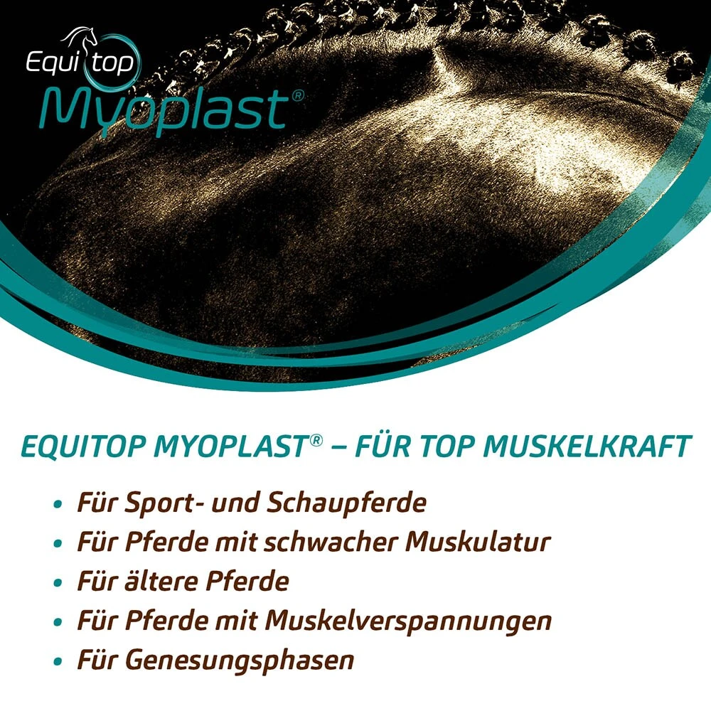 Equitop Myoplast® soll über einen Zeitraum von mindestens 4 Wochen verabreicht werden. Eine Verbesserung von Rittigkeit, Bemuskelung, Gesamtkondition oder Leistungsbereitschaft sollte je nach Ausgangszustand des Pferdes nach ca. 4 Wochen feststellbar sein. Bei Bedarf, wie z.B. im Leistungssport bzw. nach einer tierärztlichen Empfehlung, sind auch Dauer- und Intervallgaben möglich.