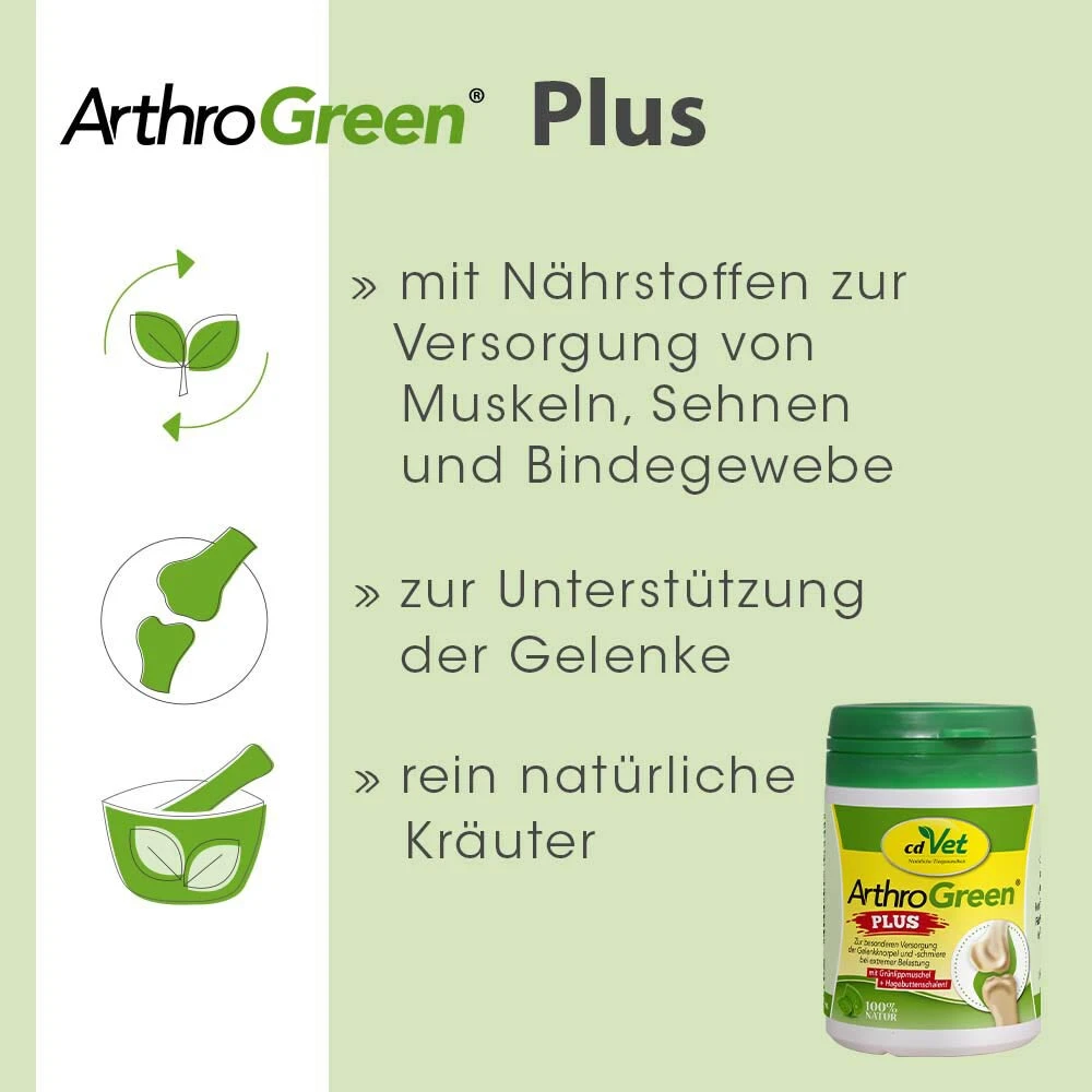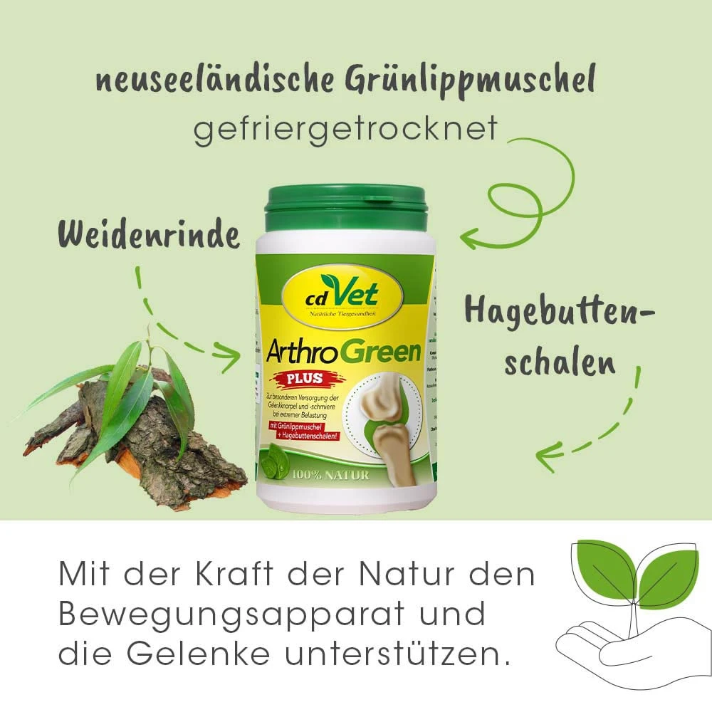 ArthroGreen plus enthält die bewährte ArthroGreen Rezeptur und wurde zusätzlich mit Hagebutte und Weidenrinde angereichert. Dadurch eignet es sich besonders um den Bewegungsapparat und die Gelenke in akuten Phasen optimal auf natürliche Weise zu unterstützen. Die enthaltenen Hagebuttenschalen zeichnen sich durch ihren hohen Gehalt an Vitamin C, Pektinen, Fruchtsäuren und Carotinoiden aus. Vitamin C ist von großer Bedeutung für die Kollagenbiosynthese und damit für die Festigkeit von Knochen und Knorpel. Durch die ausgewählte Kombination mit dem in der Weidenrinde enthaltenen Salicin kann ArthroGreen plus eine natürliche, ernährungsbedingte Unterstützung sein.