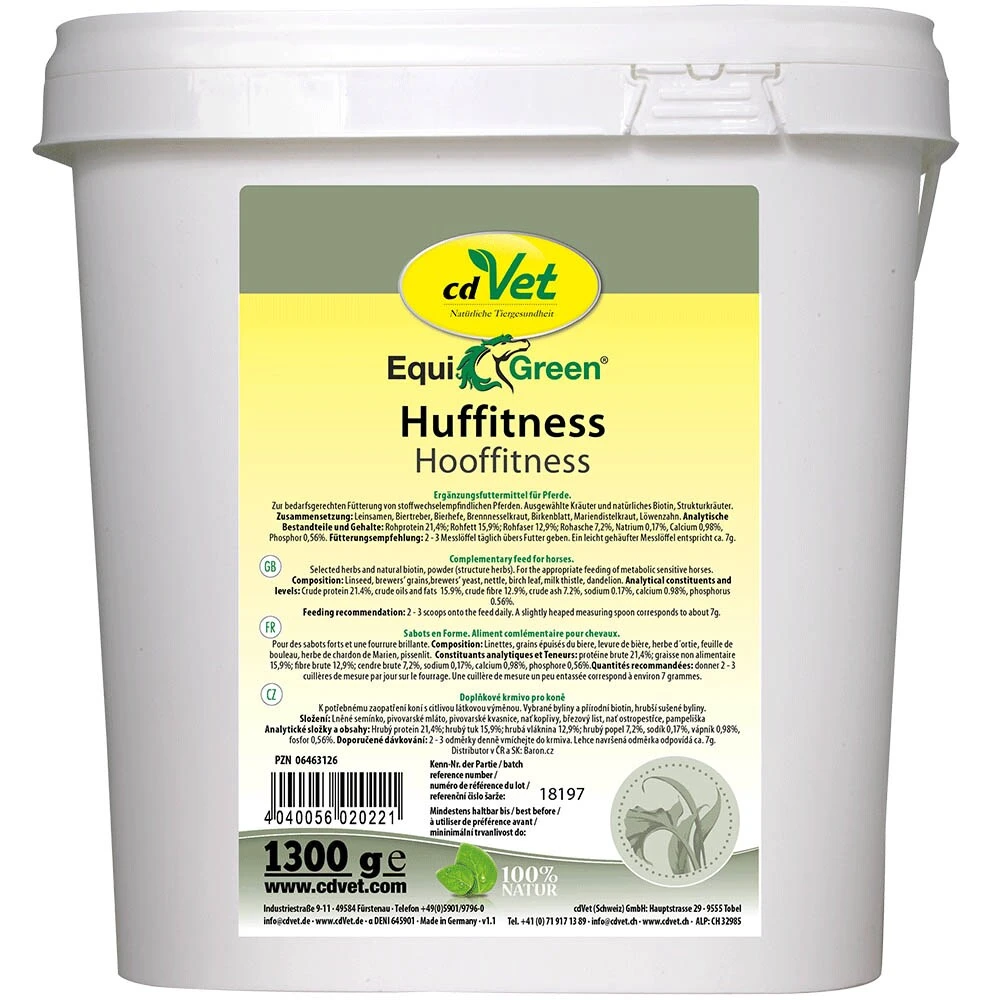 Eine optimale Versorgung mit Vitaminen, Spurenelementen und ausgesuchten Kräutern unterstützt die physiologischen Organfunktionen und Stoffwechselvorgänge, die u.a. für ein gesundes Hufwachstum notwendig sind. EquiGreen HufFitness fördert ernährungsbedingt durch wertvolle Kräuter, lebenswichtige Vitamine (vor allem B-Vitamine – Biotin), sowie Mineralstoffe ein gesundes Hufwachstum und gibt dem Pferd ein schönes und glänzendes Fell.