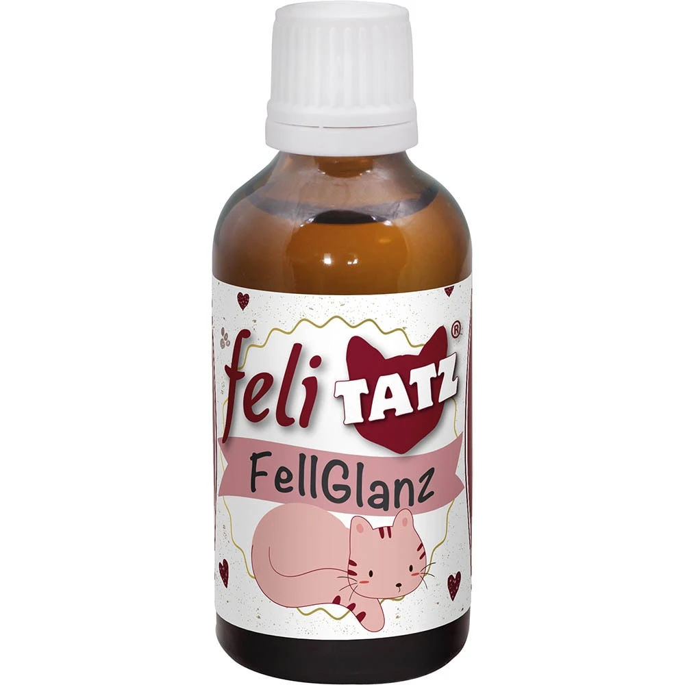 feliTATZ FellGlanz ist eine Mischung aus hochwertigen, kaltgepressten Pflanzenölen in Bio-Qualität mit bestem Lachsöl. Die beigemischten Pflanzenöle tragen zu einer ausgewogenen Versorgung mit essentiellen Fettsäuren bei. Die hochwertigen Inhaltstoffe verleihen dem Fell Ihrer Katze Glanz und Geschmeidigkeit. Aufgrund des Lachsöls wird feliTATZ FellGlanz sehr gern von Katzen angenommen.