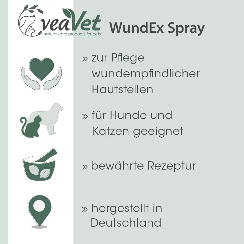 VeaVet WundEx Spray ist ein natürliches Produkt zur besonderen Pflege wundempfindlicher Hautstellen. Durch seine pflegenden und gut verträglichen Eigenschaften eignet es sich besonders auch bei empfindlicher Haut. VeaVet WundEx Spray versorgt gestresste Haut mit natürlichen Mineralien und essentiellen Fettsäuren und trägt pflegebedingt zur Hautgesundheit bei.