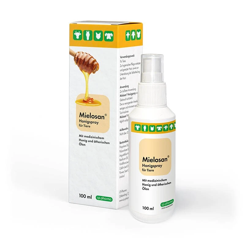 Mielosan® Spray ist ein Spray auf der Basis von Honig und ätherischen Ölen. Der im Mielosan® Spray enthaltene medizinische Honig besitzt einen besonders hohen Enzymgehalt und einen niedrigen pH-Wert. Nach dem Aufbringen auf die betroffenen Bereiche produzieren diese Honigenzyme über einen längeren Zeitraum kleine Mengen an Wasserstoffperoxid, bekannt für seine keimabtötenden Eigenschaften. Durch den niedrigen pH-Wert werden optimale Bedingungen für die Selbstheilung der Haut geschaffen. Die naturreinen ätherischen Öle besitzen ein für Fliegen unattraktives Aroma, sie fördern die Regeneration gereizter Haut und unterstützen die hygienischen Eigenschaften des medizinischen Honigs.
