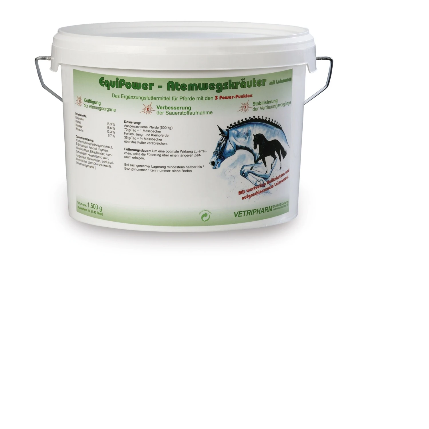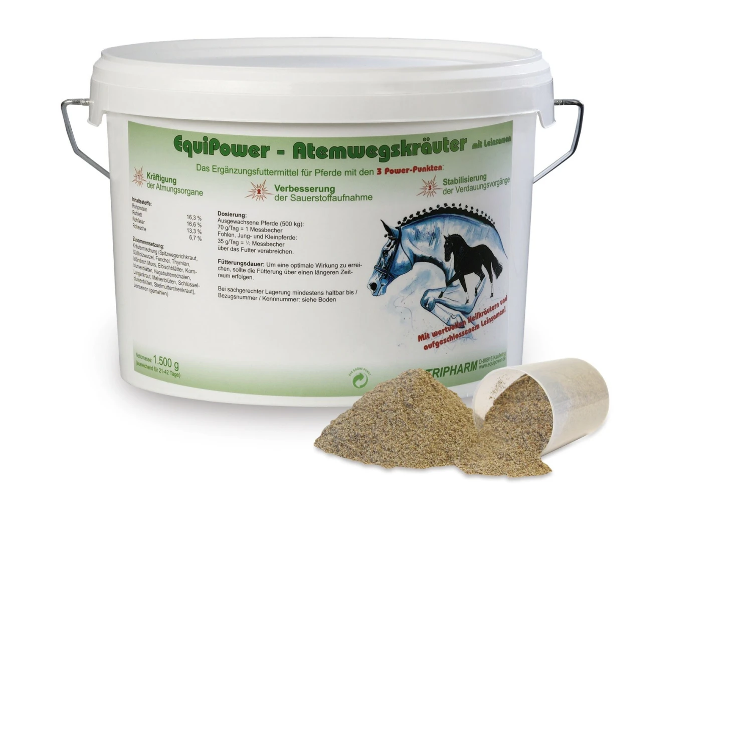 EquiPower – Atemwegskräuter setzen sich aus 13 speziell aufeinander abgestimmten Heilpflanzen zusammen. Die vielfältigen Wirkstoffe der Kräuter unterstützen und potenzieren sich in Ihrer harmonischen Wirkung auf die Atemwege. Atemwegskräuter sind in ihrer Zusammensetzung so gewählt, dass sie speziell im Bereich der Atmungsorgane anregend, regulierend und kräftigend wirken.