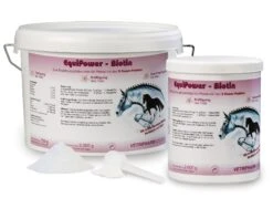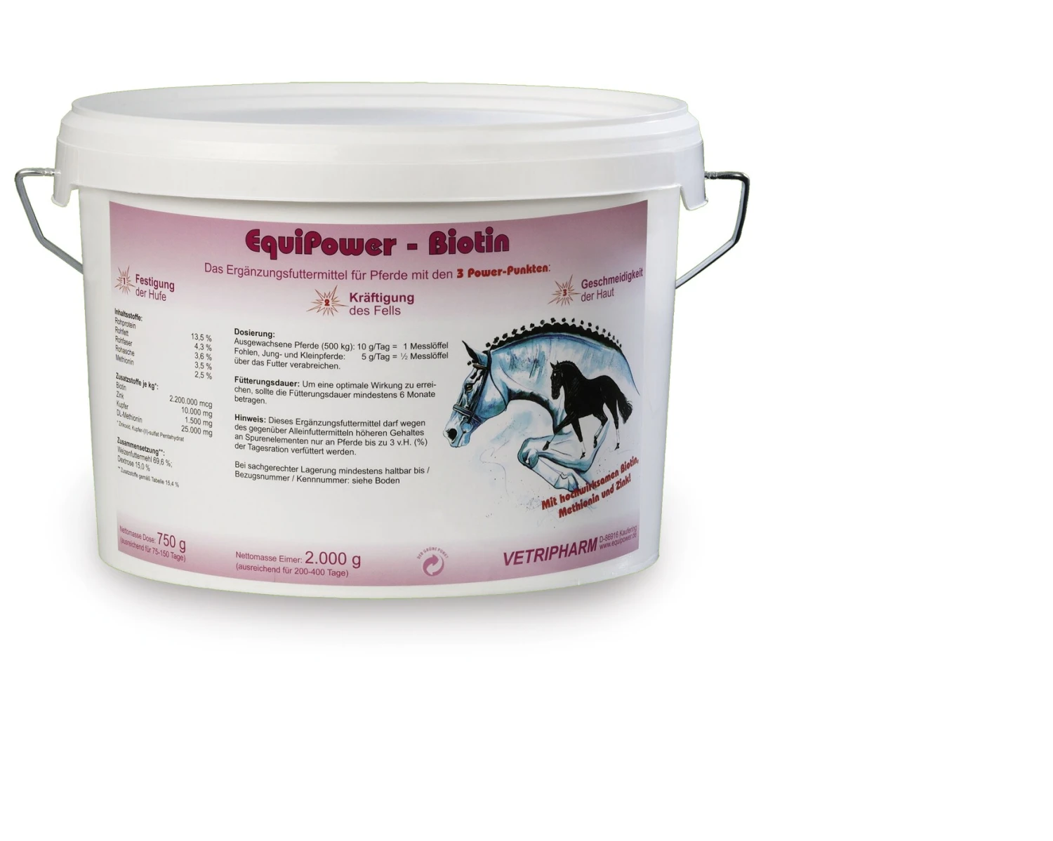 Biotin bietet eine optimale Nährstoffversorgung für gesunde Hufe, Haut und Haare mit Biotin, Methionin, Zink und Kupfer. Biotin gleicht den Mangel an Biotin, Zink, Kupfer und schwefelhaltigen Aminosäuren aus, der bei einseitiger Fütterung oder bei Störungen im Verdauungsablauf auftreten kann. EquiPower – Biotin sollte bei sämtlichen Problemen der Haut und der Haare für mindestens 3 Monate, bei Problemen im Hufbereich für 6 – 12 Monate angewendet werden.