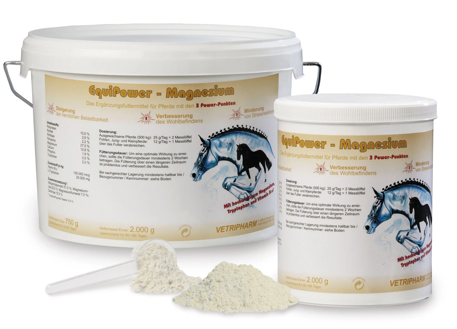 Im Regelfall kann der Bedarf an Magnesium über die Grundfütterung gedeckt werden. Dennoch werden bei Anstrengung größere Mengen an Magnesium über den Schweiß ausgeschieden. Auch über den Urin geht eine nicht unbeträchtliche Menge verloren. Im Wachstum oder während der Laktation ist der Bedarf ebenso erhöht. Daher ist ein Mangel an Magnesium bei Pferden im Training – insbesondere an heißen Tagen und Stuten mit Fohlen nicht ungewöhnlich. Es empfiehlt sich daher zusätzlich Magnesium zu verabreichen. Pferde sind gegenüber höheren Magnesiumgaben sehr tolerant; d.h. Überdosierungen werden i.d.R. ausgeschieden.