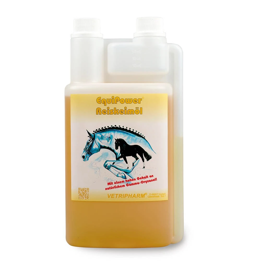 Besonders hervorzuheben ist beim Reiskeimöl der hohe Vitamin E-Gehalt, die ungesättigten Fettsäuren und der für den Muskelstoffwechsel förderliche natürliche Anteil an Gamma Oryzanol – ein nur im Reiskeimöl vorkommendes Pflanzenfett. Die nativen Bestandteile des Öls fördern die Energieverwertung und den Energiestoffwechsel des Pferdes. Erwachsene Pferde erhalten während des Muskelaufbautraining täglich 25 ml Reiskeimöl. Idealerweise sollte die Fütterung über mindestens 4 bis 6 Wochen erfolgen. In Zeiten verstärkter Bewegung kann die Dosierung verdoppelt und auf zwei Rationen verteilt verabreicht werden.
