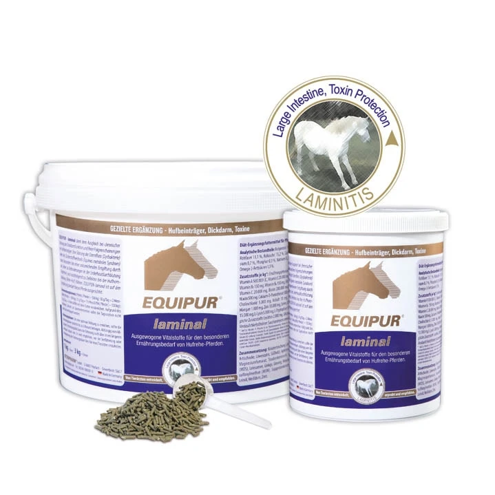 EQUIPUR – laminal dient bei Hufrehe-anfälligen Pferden der Stabilisierung der physiologischen Verdauung des Dickdarms. Eine Störung der Darmflora (Dysbakterie) oder des Zuckerstoffwechsels (Equines metaboles Syndrom) kann besonders bei einer unzureichenden Entgiftung durch die Leber zu Behinderungen in der Lederhautdurchblutung (Hufrehe) und nachfolgend zu Defekten bei der Hufhornbildung (Rehe-Huf) führen. EQUIPUR-laminal ist auf den Ernährungsbedarf dieser Pferde ausgerichtet.