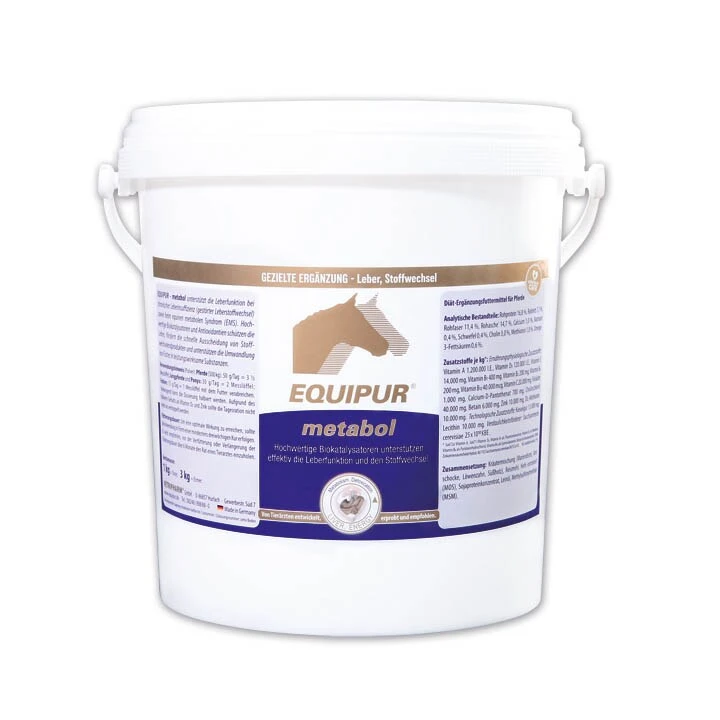EQUIPUR – metabol unterstützt die Leberfunktion bei chronischer Leberinsuffizienz (gestörter Leberstoffwechsel) sowie beim equinen metabolen Syndrom (EMS). Hochwertige Biokatalysatoren und Antioxidantien schützen die Leber, fördern die schnelle Ausscheidung von Stoffwechselendprodukten und unterstützen die Umwandlung von Futter in leistungswirksame Substanzen.