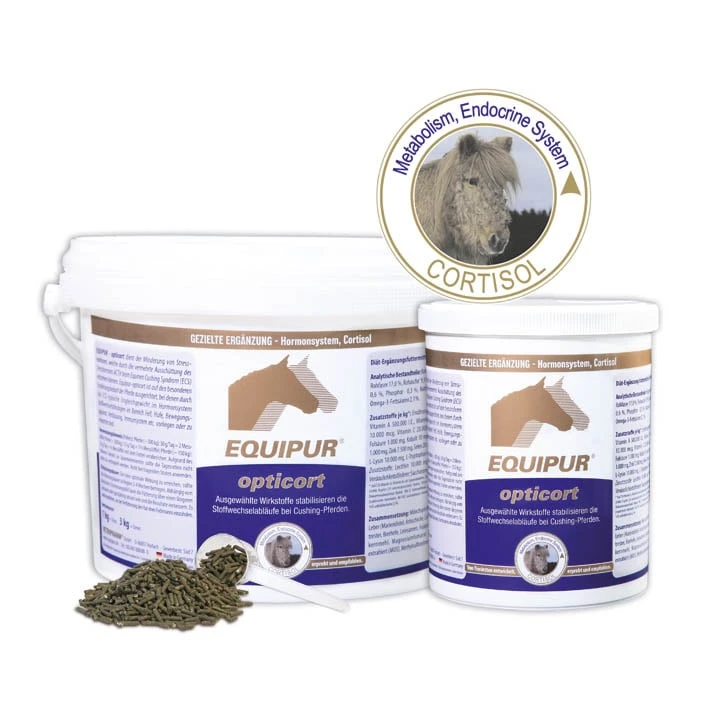 EQUIPUR – opticort gleicht fütterungsbedingte Vitalstoffmängel, welche durch die vermehrte Ausschüttung des Stresshormons ACTH beim Equinen Cushing Syndrom (ECS) entstehen können, wirksam aus. Durch das ECS-typische Ungleichgewicht im Hormonsystem liegt besonders im Bereich Fell, Hufe, Bewegungsapparat, Verdauung, Immunsystem etc. ein spezieller Ernährungsbedarf vor.