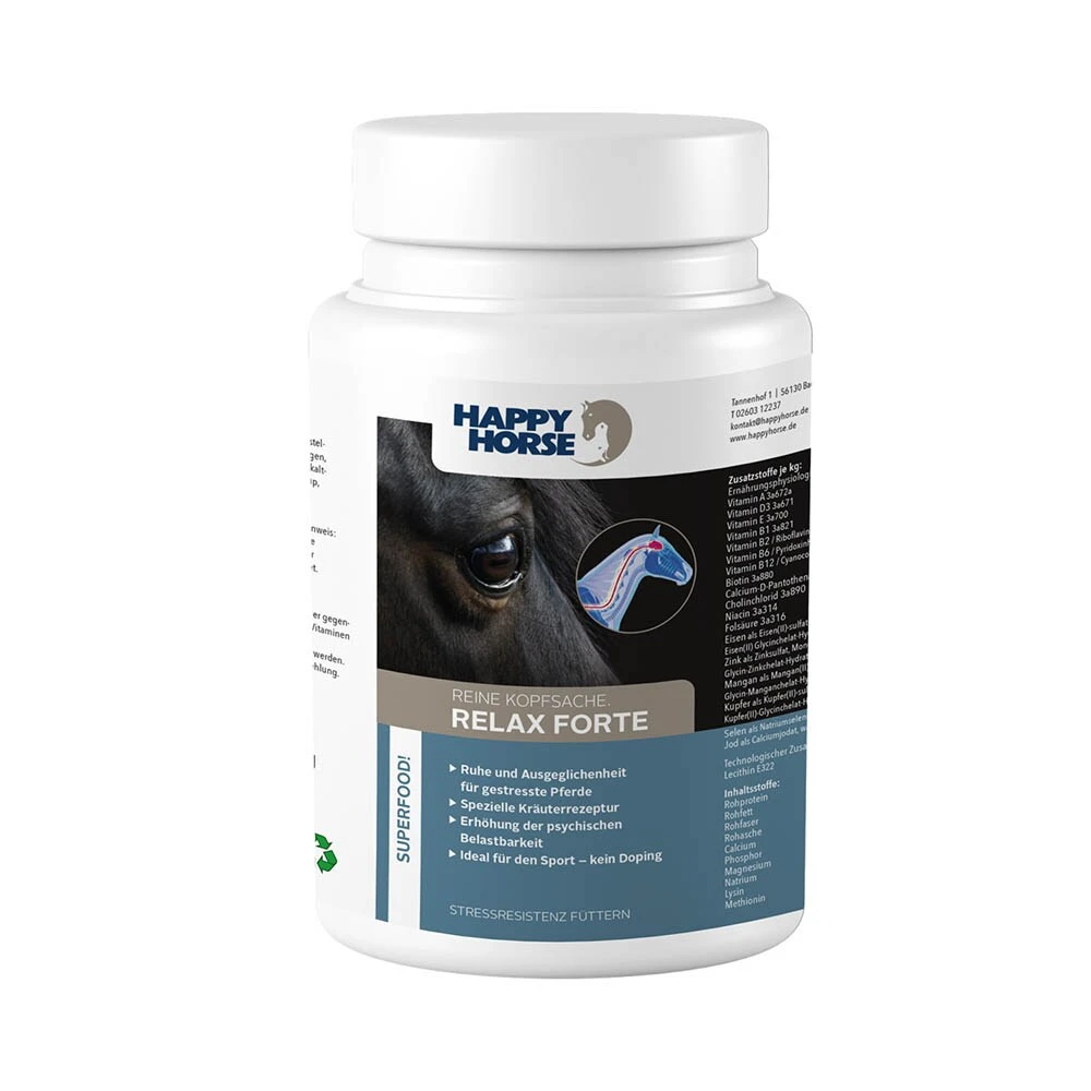 „Relax Forte“ ermöglicht den Pferden durch eine spezielle Kräutermischung wieder ihre Balance zu finden. Die vitalstoffreichen Kräuter Ginseng, Taigawurzel, Kamille, Melisse und Propolis fördern die psychische Belastbarkeit. Ein hochverfügbarer Magnesium-Proteinkomplex dämpft die Ausschüttung von Stresshormonen und sorgt für die nötige Gelassenheit. Das zugefügte Lezithin gewährleistet in Verbindung mit den in Bierhefe und Malzextrakt enthaltenen B-Vitaminen eine stabile Übertragung von Nervenimpulsen. Obstessig, Chlorellaalgen und Propolis helfen bei der Beseitigung von Gift-und Schlackenstoffen im Nervensystem. Auch Radikalstoffe werden durch die ausgeklügelte Kräuterzusammensetzung aktiv bekämpft und die Belastung des Pferdeorganismus somit wirksam reduziert. Zahlreiche praktische Erfahrungen zeigen, dass „Be cool my friend“ die Konzentration und Aufmerksam des Pferdes fördern und Stresssituation besser bewältigen lassen.