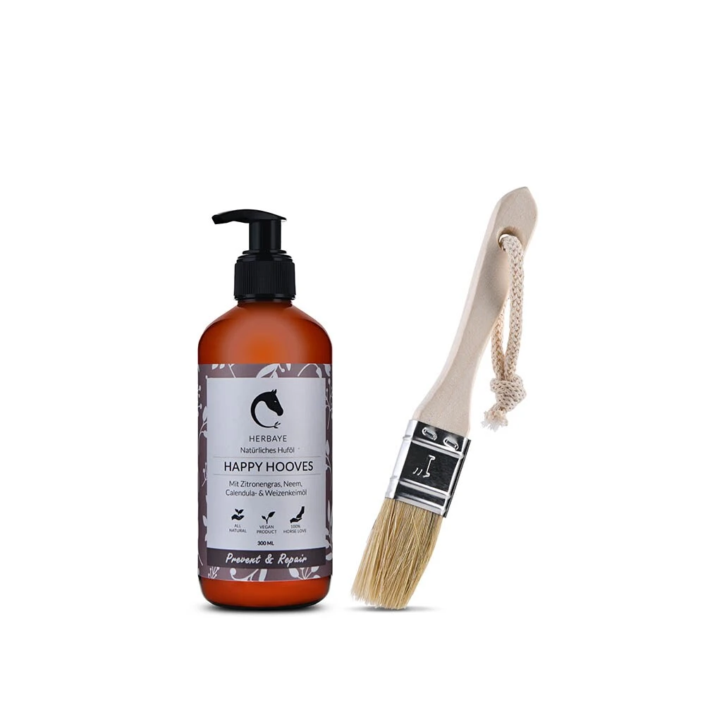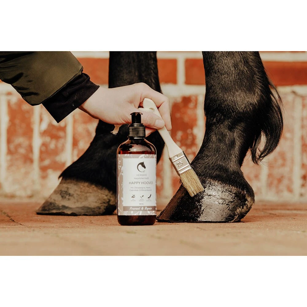 Die sorgfältig ausgewählte Kombination aus Fettsäuren, ätherischen Ölen und Vitaminen des natürlichen Happy Hooves Huföls schützt die Hufe Deines Pferdes vor rauen Umweltbedingungen. Eukalyptus- und Loorbeeröl regen die Durchblutung an, während wirksame Inhaltsstoffe wie Weizenkeim-, Mandel- und Calendulaöl dabei helfen, die natürlichen Prozesse eines gesunden Hufwachstums zu fördern.Das enthaltende Sesamöl wird leicht von der Hornmasse aufgenommen und unterstützt dabei den natürlichen Feuchtigkeitsgehalt der Hufe zu erhalten. Die Hufporen verstopfen durch die schnelle Aufnahme des reinen Pflanzenöls nicht. Ausgesuchte ätherische Öle, wie Zitronengras und Teebaum beugen Pilz- und Bakterienbefall vor und wirken desinfizierend.