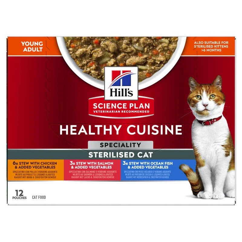 Hills Science Plan Healthy Cuisine liefert eine 100 % ausgewogene, gesunde Ernährung und hat dabei einen unwiderstehlichen Geschmack, den Ihre Katze lieben wird. Hergestellt mit hochwertigen Zutaten. Hochwertiges Protein für schlanke Muskeln und Antioxidantien zur Unterstützung des Immunsystems. Die Science Plan Healthy Cuisine Ragouts können als Alleinfutter, gemischt mit Trockenfutter oder als schmackhaftes, verlockendes Topping gefüttert werden. Höhere Wasserzufuhr*. *Bitte stellen Sie jederzeit frisches Wasser für Ihr Tier bereit.