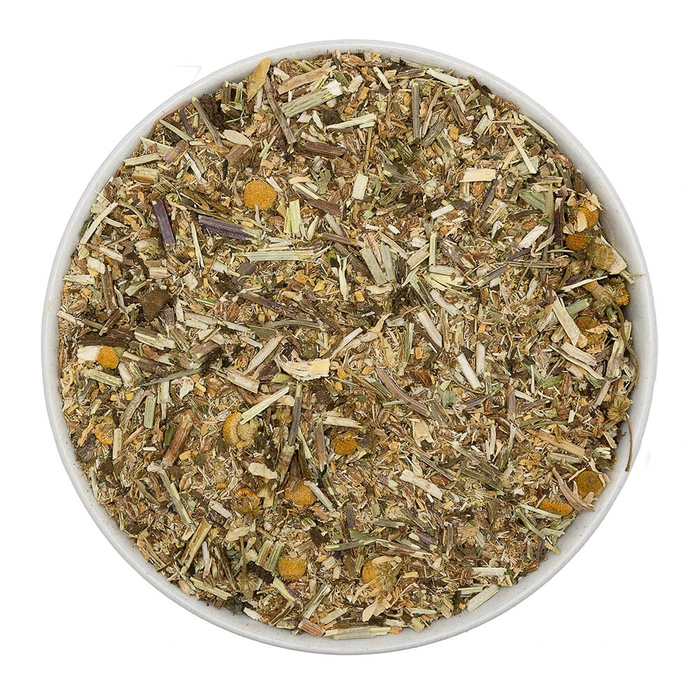 Süßholz, Kamille, Pfefferminzkraut, Kümmel, Wegwarte, Pfefferminzblätter, Kamillenblüten.