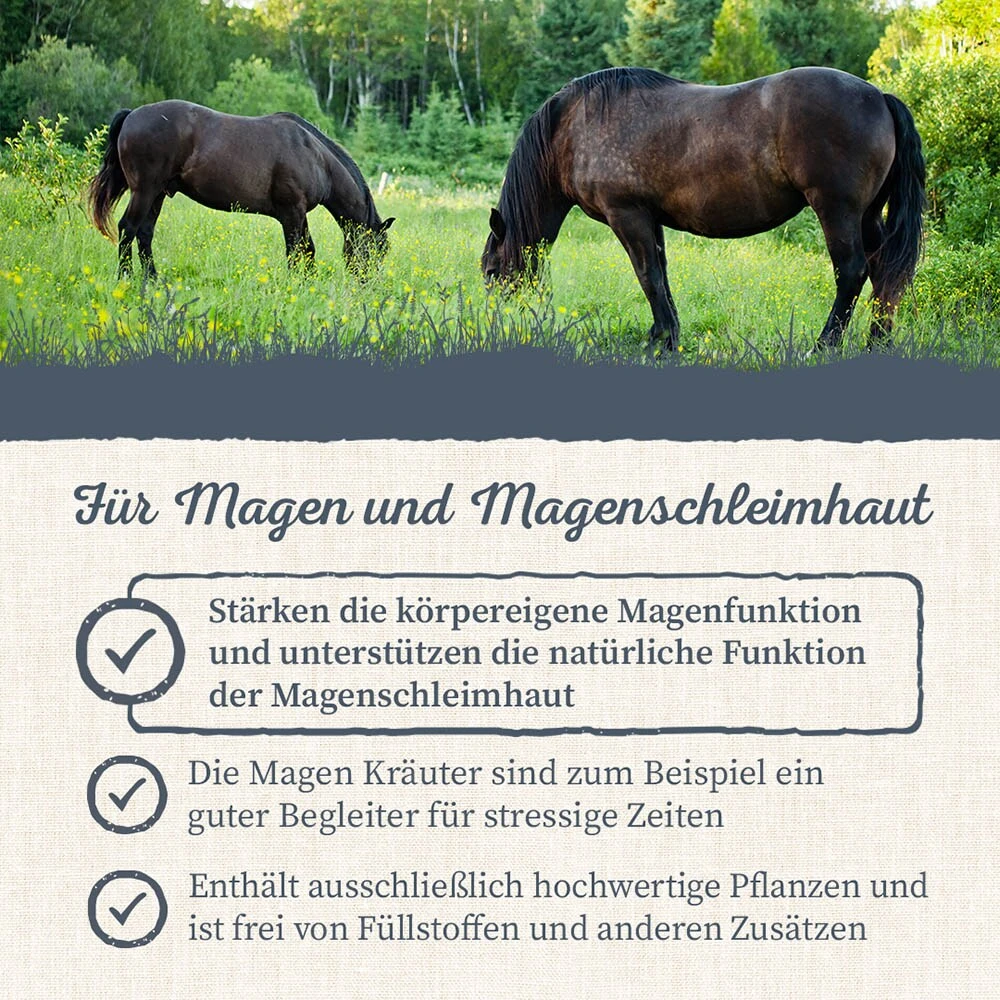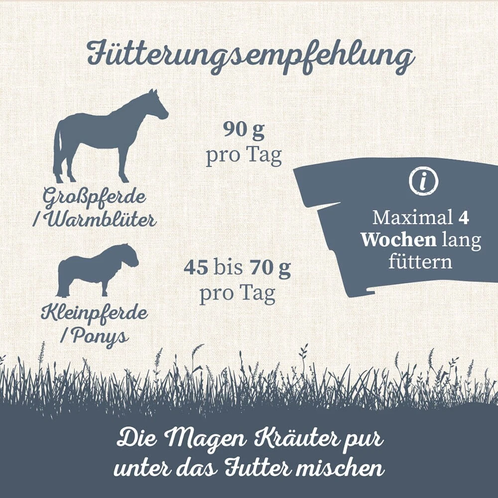 Pferde, die Kräuter noch nicht kennen, sollten vorsichtig daran gewöhnt werden. In der Regel ist eine solche Gewöhnung problemlos möglich. Beim Füttern wird am besten mit einer sehr kleinen Menge (Drei-Finger-Prise) begonnen, die unter ein beliebtes Grundfutter gemischt wird. Akzeptiert das Pferd den Geschmack, kann die Portion langsam bis zur gewünschten Tagesmenge gesteigert werden. Die Magen Kräuter können anschließend auch als Sud zubereitet und gefüttert werden. Dafür die Tagesportion in einem hitzebeständigen Gefäß mit kochendem Wasser übergießen. Den Sud abkühlen lassen und dann im Ganzen unter das Futter mischen.