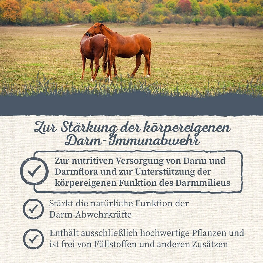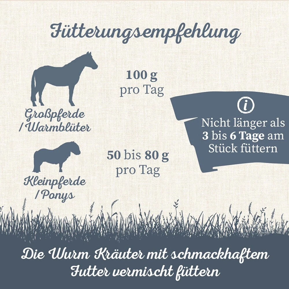 Einige der Pflanzenzutaten dieser Mischung enthalten Scharf- und Bitterstoffe. Bei magenempfindlichen Pferden empfiehlt es sich darum, etwa 20 bis 40 g Kamillenblüten pro Portion Wurm Kräuter mit zufüttern. Diese Mischung stärkt die natürliche Immunfunktion des Darms. Sie ersetzt keine chemische Wurmkur. Bitte lassen Sie Ihr Pferd von Ihrem Tierarzt regelmäßig auf Wurmbefall kontrollieren.