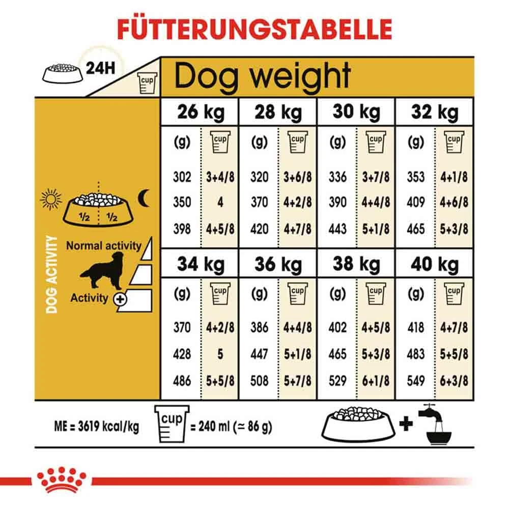 ROYAL CANIN Golden Retriever Adult ist für ausgewachsene Hunde ab dem 15. Monat geeignet. Die Trockennahrung enthält Nährstoffe, die eine gesunde Herzfunktion unterstützen – z. B. einen angepassten Mineralstoffgehalt, EPA & DHA, Taurin, L-Carnitin und Antioxidanzien. Außerdem trägt ROYAL CANIN Golden Retriever Adult zur Aufrechterhaltung des optimalen Körpergewichtes Ihres Hundes bei.