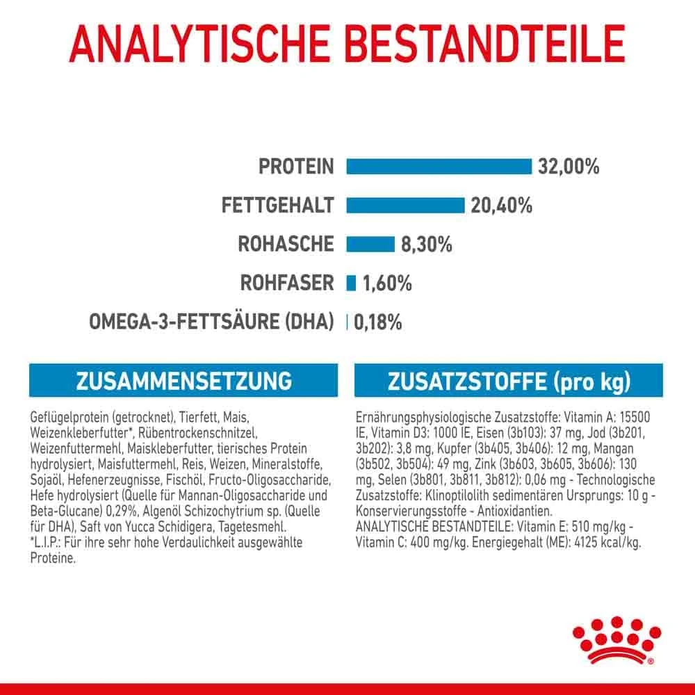 Geflügelprotein (getrocknet), Tierfett, Rinder- und Schweineproteine (getrocknet), Mais, Weizenfuttermehl, Rübentrockenschnitzel, Reis, tierisches Protein hydrolysiert, Maisfuttermehl, Weizen, Maiskleberfutter, Weizenkleberfutter*, Mineralstoffe, Sojaöl, Hefenerzeugnisse, Fischöl, Fructo-Oligosaccharide, Hefe hydrolysiert (Quelle für Mannan-Oligosaccharide und Beta-Glucane) 0,29%, Algenöl Schizochytrium sp. (Quelle für DHA), Saft von Yucca Schidigera, Tagetesmehl. *L.I.P.: Für ihre sehr hohe Verdaulichkeit ausgewählte Proteine.