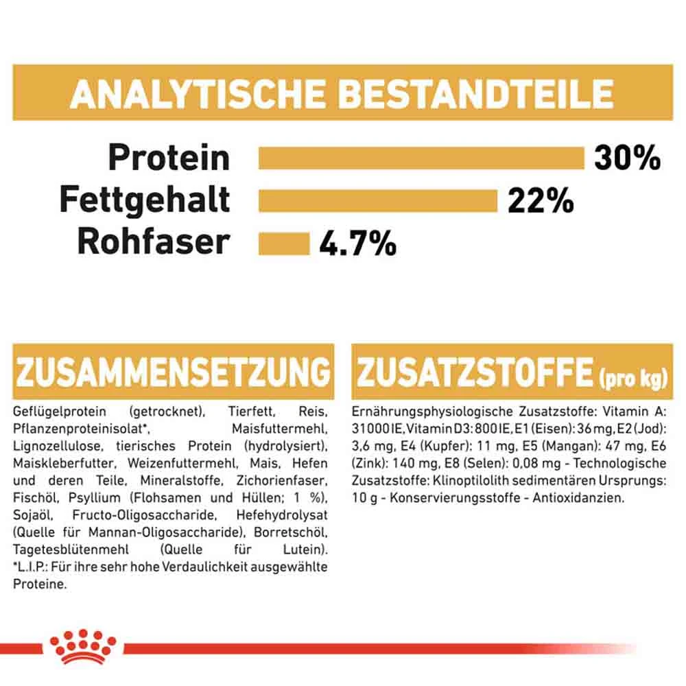Geflügelprotein (getrocknet), Tierfett, Reis, Pflanzenproteinisolat*, Maisfuttermehl, Lignozellulose, tierisches Protein (hydrolysiert), Maiskleberfutter, Weizenfuttermehl, Mais, Hefen und deren Teile, Mineralstoffe, Zichorienfaser, Fischöl, Psyllium (Flohsamen und Hüllen; 1%), Sojaöl, Fructo-Oligosaccharide, Hefehydrolysat (Quelle für Mannan-Oligosaccharide), Borretschöl, Tagetesblütenmehl (Quelle für Lutein).