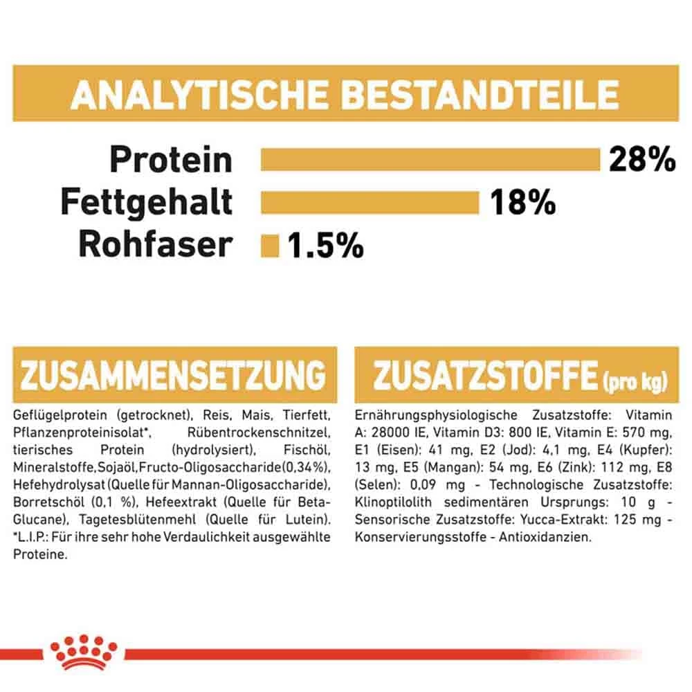 Geflügelprotein (getrocknet), Reis, Mais, Tierfett, Pflanzenproteinisolat*, Rübentrockenschnitzel, tierisches Protein (hydrolysiert), Fischöl, Mineralstoffe, Sojaöl, Fructo-Oligosaccharide (0,34 %), Hefehydrolysat (Quelle für Mannan-Oligosaccharide), Borretschöl (0,1%), Hefeextrakt (Quelle für Beta-Glucane), Tagetesblütenmehl (Quelle für Lutein).