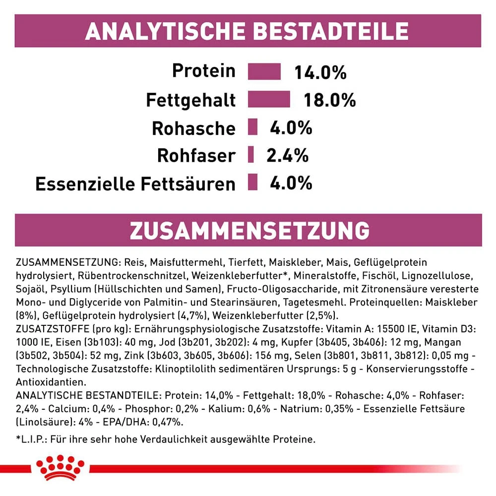 Reis, Maisfuttermehl, Tierfett, Maiskleber, Mais, Geflügelprotein hydrolysiert, Rübentrockenschnitzel, Weizenkleberfutter*, Mineralstoffe, Fischöl, Lignozellulose, Sojaöl, Psyllium (Hüllschichten und Samen), Fructo-Oligosaccharide, mit Zitronensäure veresterte Mono- und Diglyceride von Palmitin- und Stearinsäuren, Tagetesmehl. Proteinquellen: Maiskleber (8%), Geflügelprotein hydrolysiert (4,7%), Weizenkleberfutter (2,5%).